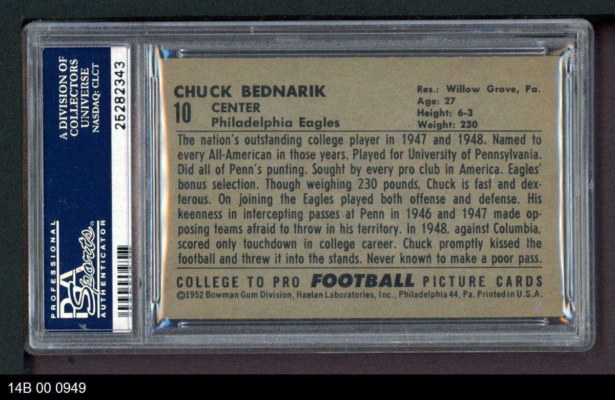 | 1952 Bowman Large #10 Chuck Bednarik | PSA 6 - EX/MT | Front | Back |