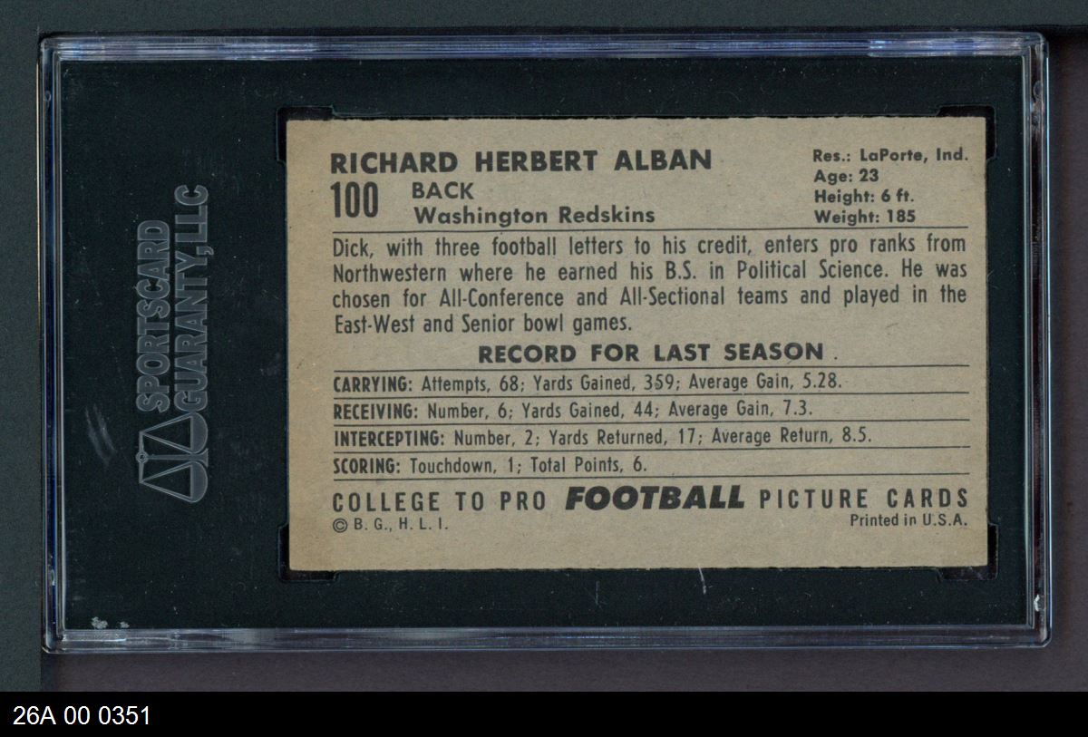 | 1952 Bowman Large #100 Dick Alban | SGC 6 - EX/MT | Front | Back |