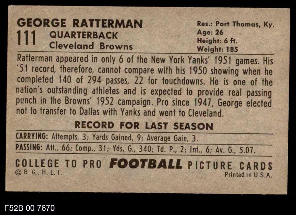 | 1952 Bowman Large #111 George Ratterman | 5 - EX | Front | Back |
