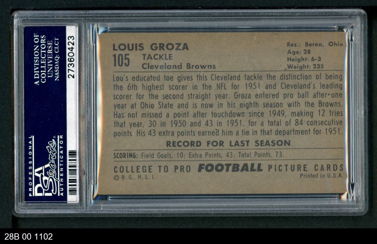 | 1952 Bowman Large #105 Lou Groza | PSA 5 - EX | Front | Back |