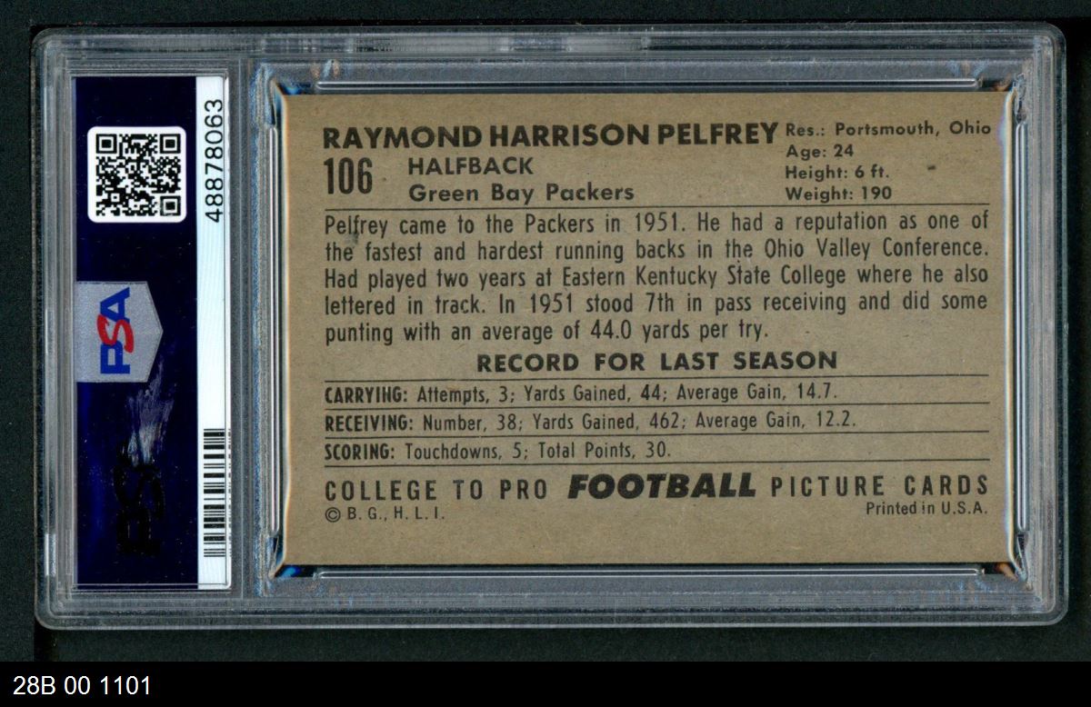| 1952 Bowman Large #106 Raymond Pelfrey | PSA 6 - EX/MT | Front | Back |