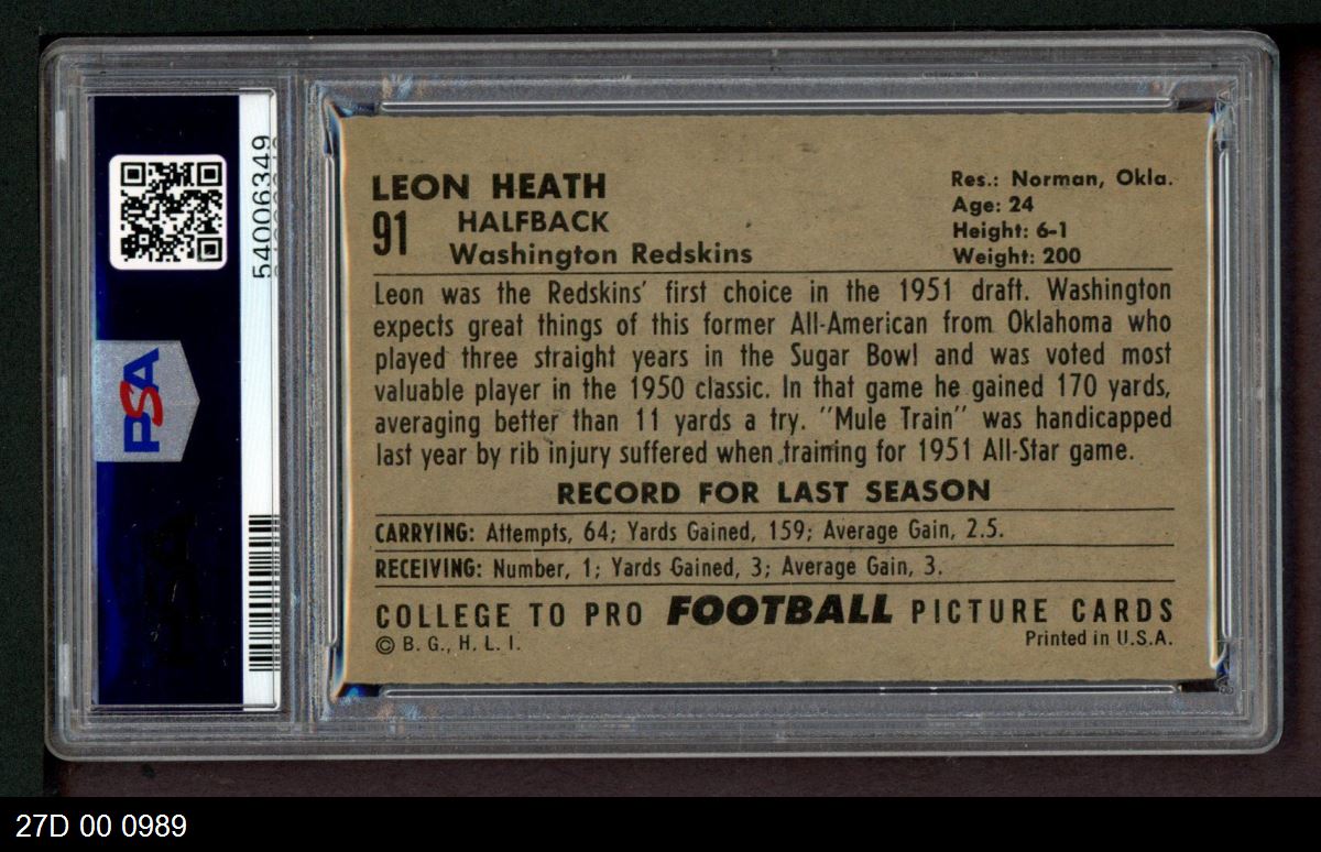 | 1952 Bowman Large #91 Leon Heath | PSA 6 - EX/MT | Front | Back |