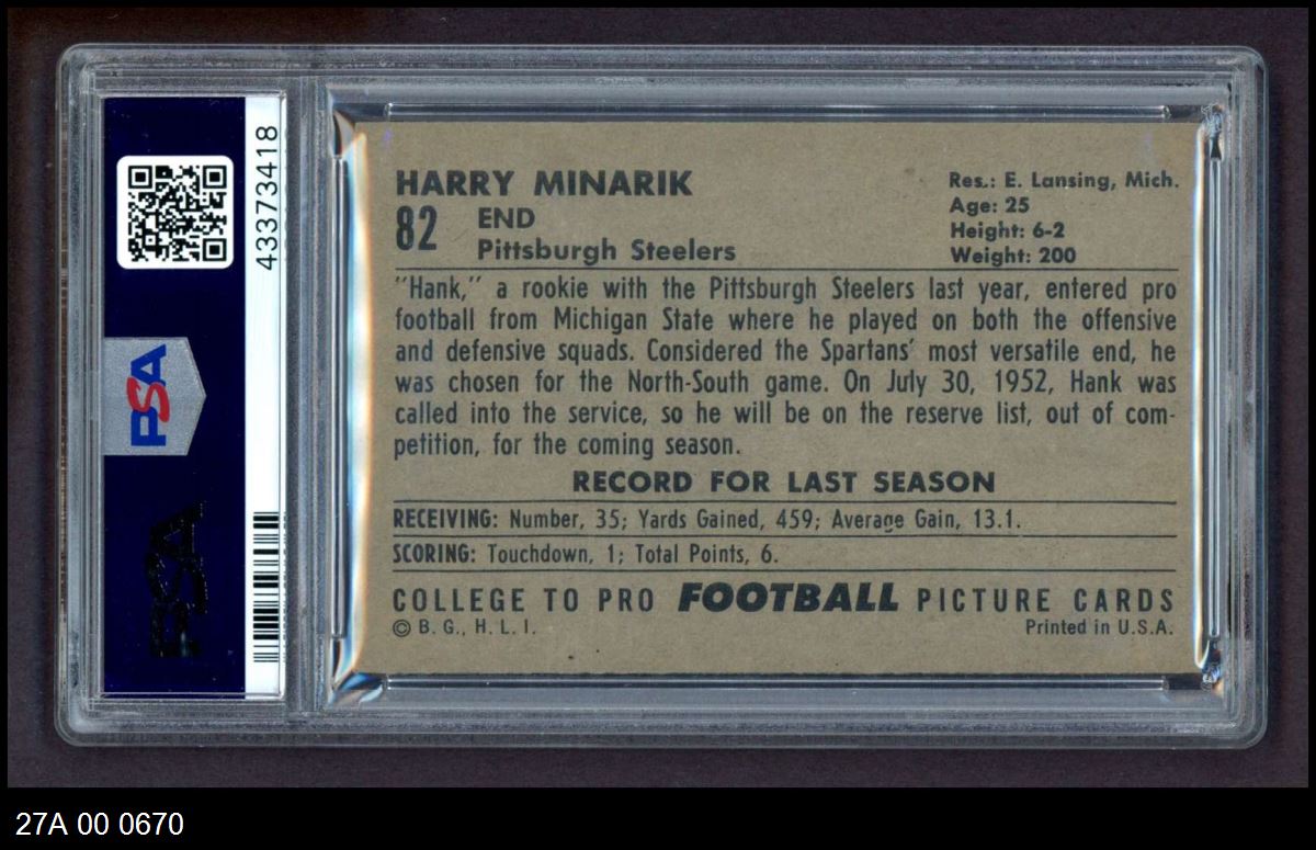 | 1952 Bowman Large #82 Harry Minarik | PSA 6 - EX/MT | Front | Back |