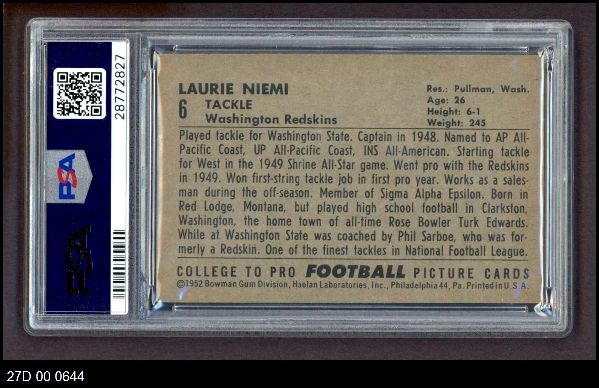 | 1952 Bowman Large #6 Laurie Niemi | PSA 6 - EX/MT | Front | Back |
