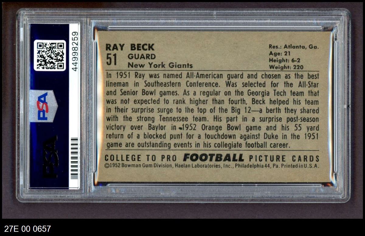 | 1952 Bowman Large #51 Ray Beck | PSA 5 - EX | Front | Back |
