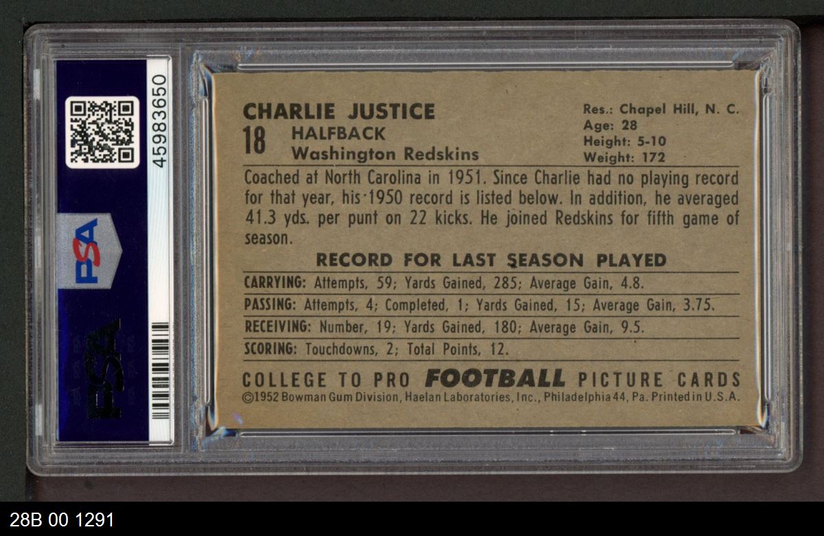 | 1952 Bowman Large #18 Charlie Justice | PSA 5 - EX | Front | Back |