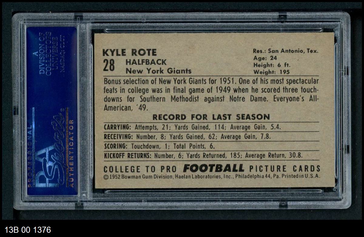 | 1952 Bowman Large #28 Kyle Rote | PSA 6 - EX/MT | Front | Back |