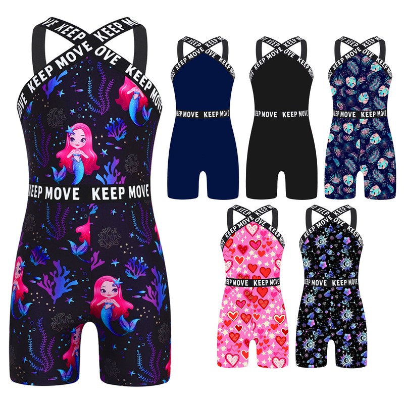 Sleeveless Wide Shoulder Straps One-Piece Swimsuit for Little and Big Girls with Horse and Stars Pattern Printing.