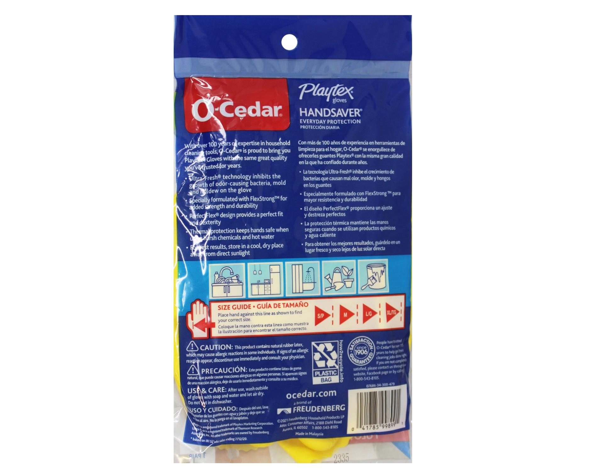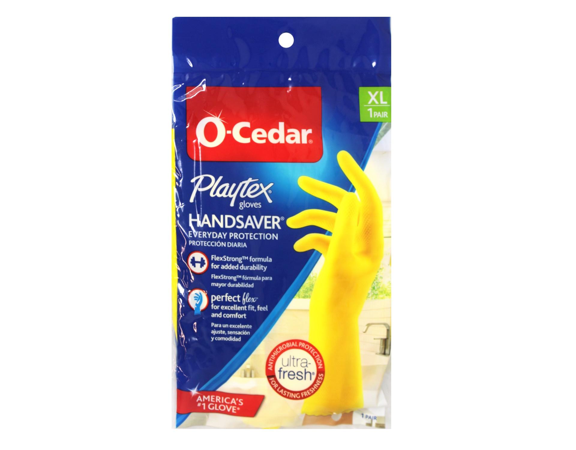 Worry-free cleaning at your fingertips. Protect your hands and nails while completing household chores or washing dishes with Playtex Handsaver Gloves. These durable and reusable gloves are the ultimate protection from scorching water and harmful chemicals. Featuring PerfectFlex design for a secure fit and enhanced grip, these hand gloves are made with durable latex, neoprene, and nitrile, and lined with a soft cotton to keep hands fresh and dry. Playtex Handsaver Gloves, Reusable Gloves, Size Large, 1 Pair Rubber gloves for cleaning and washing dishes Made with latex, neoprene, and nitrile, and a soft, cotton lining Ultra-Fresh technology inhibits the growth of odor-causing bacteria PerfectFlex design for a perfect fit with enhanced grip and comfort Textured palm and fingertips for improved grip Available in Small, Medium, and Large Use & Care After use, wash outside of gloves with soap and water and let air dry. Do not put in dishwasher.