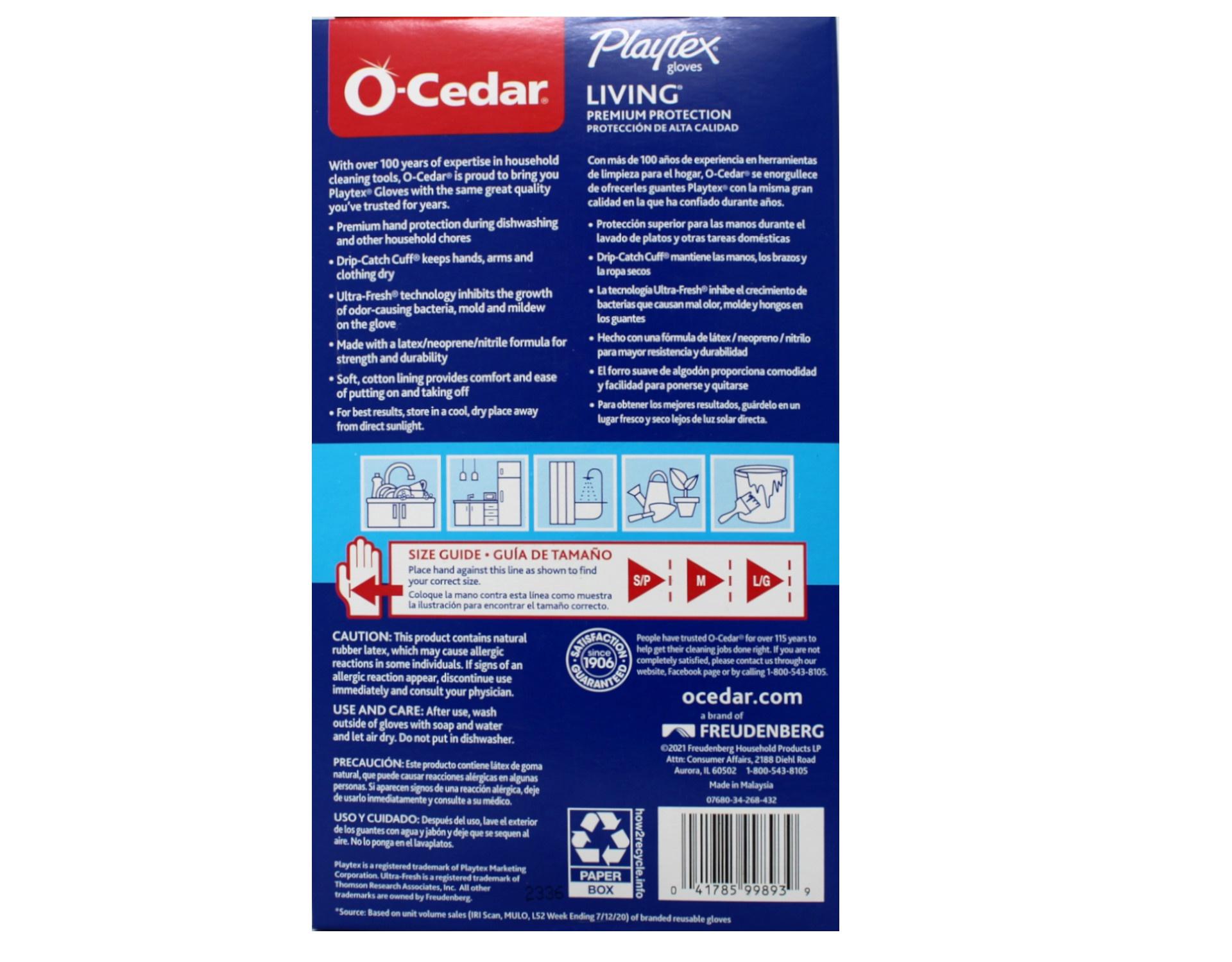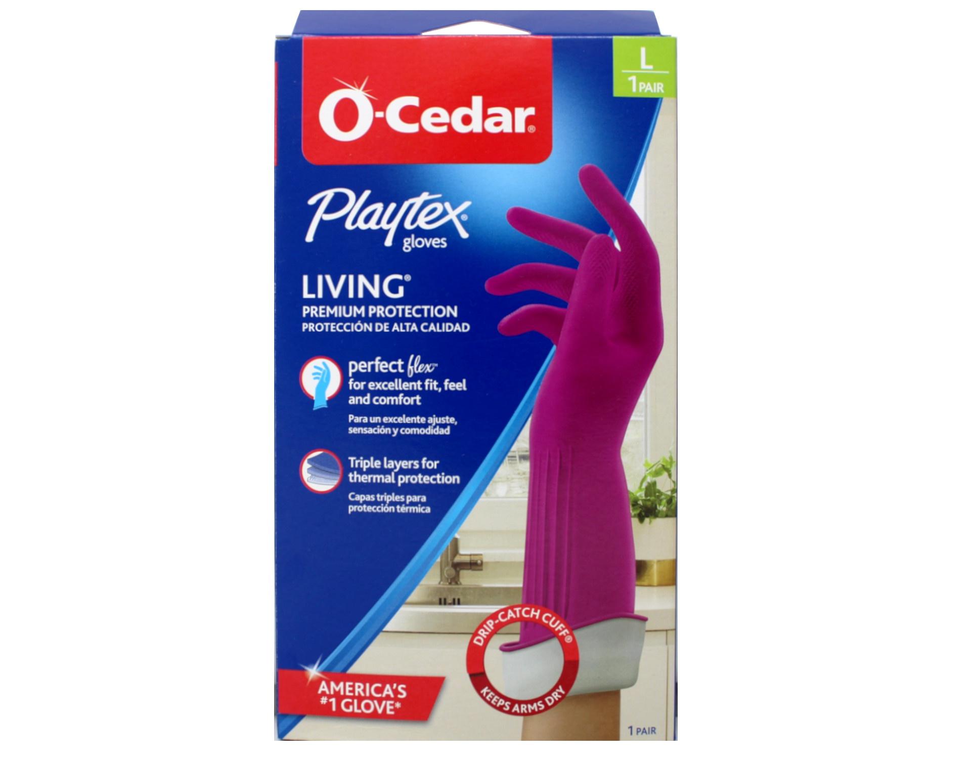Worry-free cleaning at your fingertips with the #1 reusable household gloves*. Our Playtex? Living? Gloves are durable, reusable, and provide the ultimate protection from water and harmful household chemicals. Designed with a Drip-Catch Cuff?, the extra long pair is specially designed to prevent back drip and splashes on clothing and skin. They’re complete with Ultra-Fresh? technology to inhibit bacteria growth and lingering odors on the glove. • Extra long Drip-Catch Cuff? keeps hands, arms and clothing dry • Triple-layer protection keeps hands safe • Ultra-Fresh® technology inhibits the growth of odor-causing bacteria including mold and mildew on the glove • Textured safety-grip at palm and fingertips for secure handling of wet or fragile items • Soft, cotton lining provides comfort and ease taking on and off • Perfect flex design for excellent fit, feel and comfort • Made with latex, neoprene and nitrile formula for strength and durability USE & CARE After use, wash outside of gloves with soap and water. Let air dry. Do not wash in dishwasher. For best results, store in a cool, dry place away from direct sunlight. Gloves are available in Small, Medium and Large.