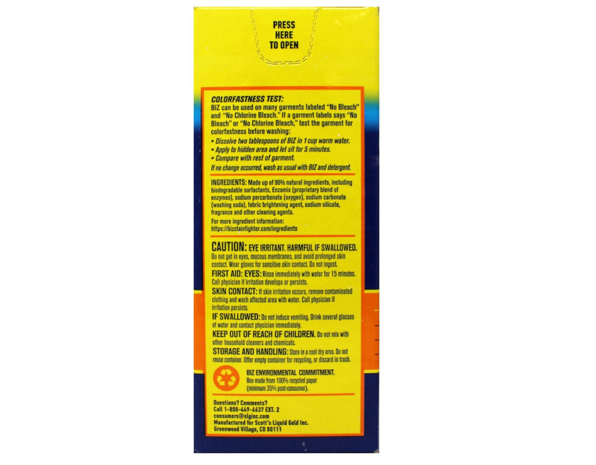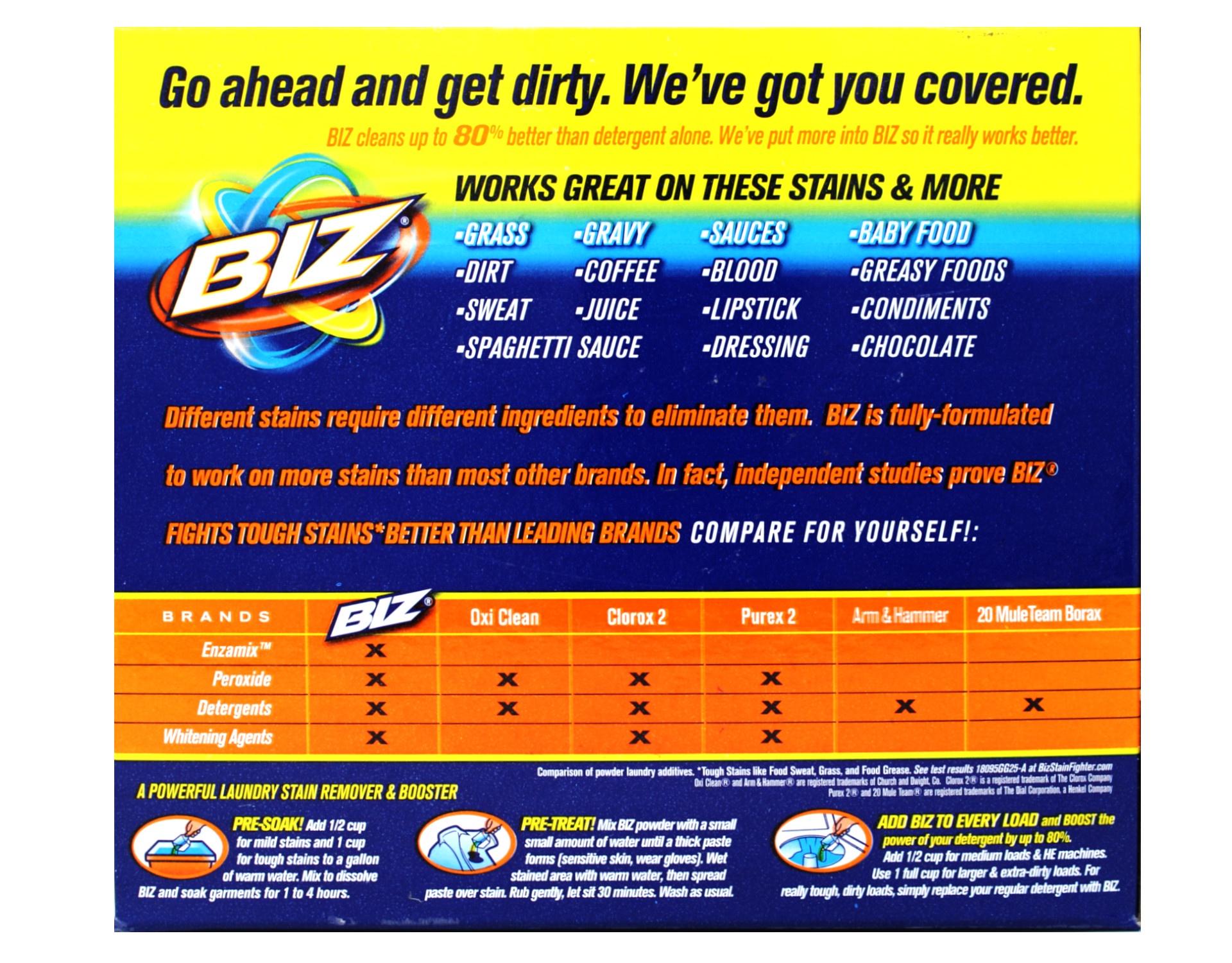 Fight tough stains and smells with the Biz Laundry Detergent Powder Booster. This high powered powder detergent booster rapidly dissolves in water to fight tough stains like grass, sweat, chocolate, and more. The powerful formula contains more of 4 stain fighting ingredients, including enzymes, peroxide, detergents, and whitening agents for an overall better wash. This booster is proven to out clean other color safe bleach for fresh, odor-free fabric all the time. The booster can be used to pre-soak stubborn stains or added in with your detergent, cleaning up to 80% better than detergent alone. Plus, it can be used on garments labeled "No Bleach" or "No Chlorine Bleach" and in front-load, standard, or HE washing machines. The 60 ounce box provides ample washing power that is easy to measure out with the included scoop for extra convenience while doing your laundry. LAUNDRY DETERGENT POWDER BOOSTER: High powered powder detergent booster rapidly dissolves in water to fight tough stains like grass, sweat, chocolate, and more 4 STAIN FIGHTERS: Powerful formula contains 4 stain fighting ingredients, including enzymes, peroxide, detergents, and whitening agents for an overall better wash TOP QUALITY CLEANING: Proven to out clean other color safe bleach for fresh, odor-free fabric all the time MULTI-PURPOSE: Use to pre-soak stubborn stains or add in with your detergent for cleaning that is up to 80% better than detergent alone 60 OUNCE BOX: Provides ample washing power that is easy to measure out and can be used on garments labeled "No Bleach" or "No Chlorine Bleach" and in front-load, standard, or HE washing machines.