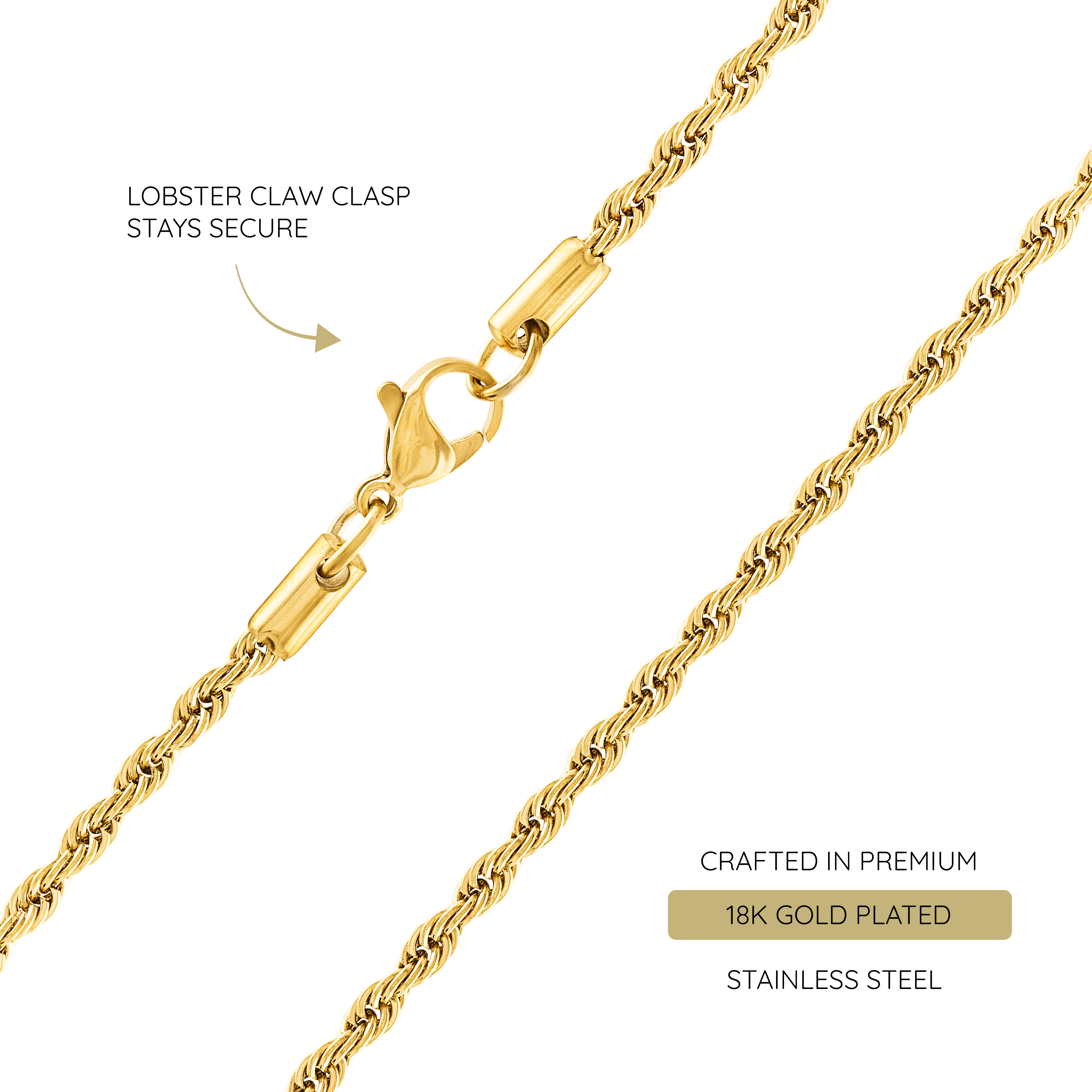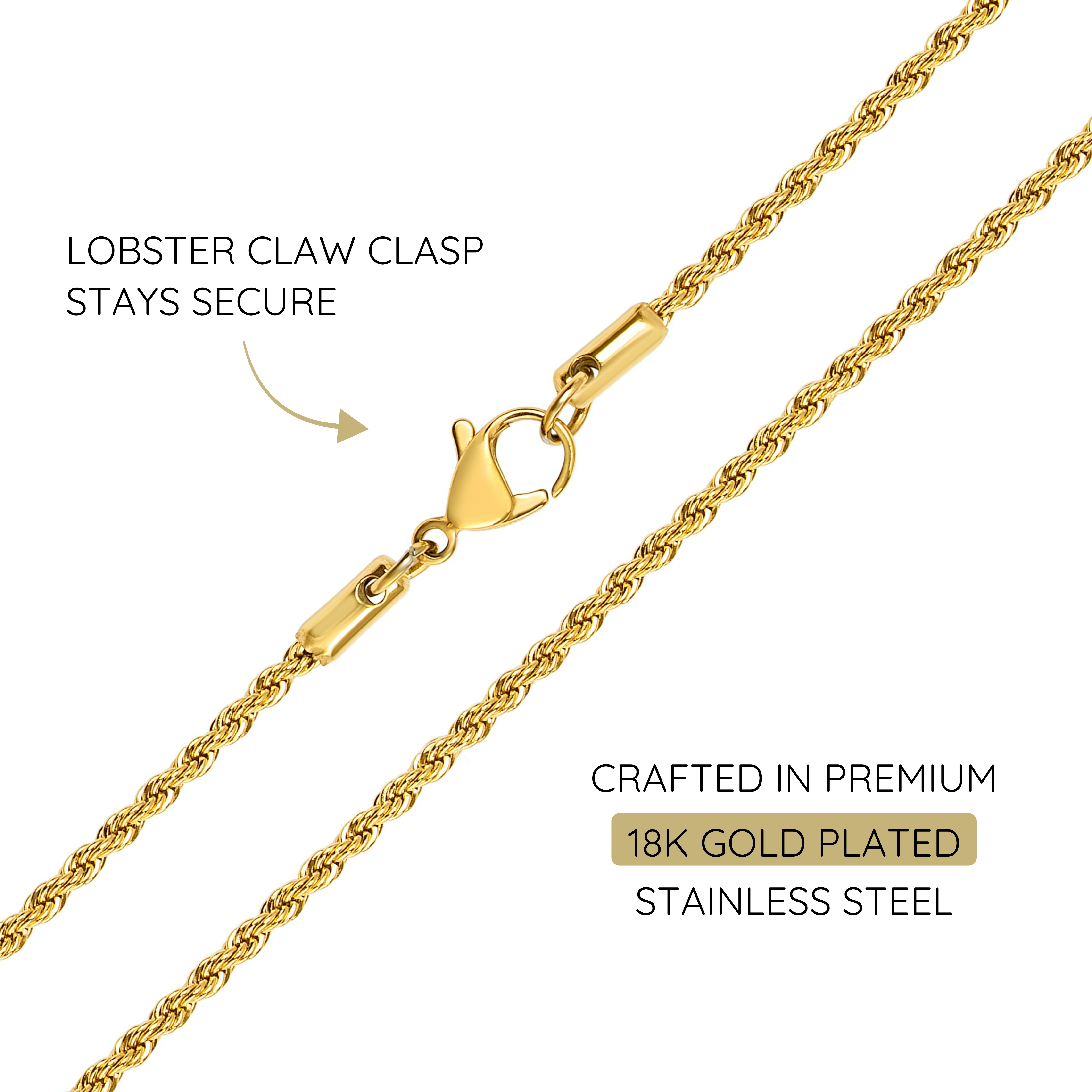 Experience sophistication and luxury with the KISPER 18k Gold Hip Hop Braided Rope Chain Necklace, offering a range of widths to suit your style. Meticulously crafted from stainless steel and adorned with a lavish 18K gold plating, this necklace embodies elegance and resilience. Its intricate braided pattern gracefully drapes around the neck, exuding a captivating allure akin to solid gold chains. Engineered with a durable lobster claw clasp, this chain seamlessly combines fashion with functionality, ensuring it can support pendants with ease. Designed to accommodate individuals of all ages and genders, this versatile accessory is tailored for a perfect fit. Packaged in a sophisticated black velvet pouch, these chains boast tarnish-resistant and hypoallergenic properties, making them ideal for gifting or personal indulgence.
