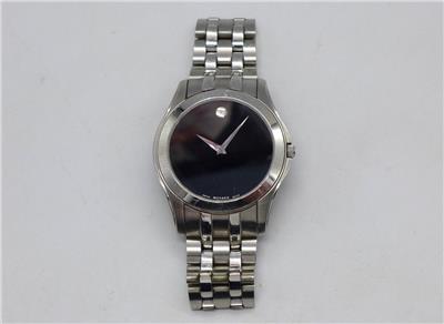 Gold Coast Jewelry presents this Movado Museum Stainless Steel Swiss Quartz Wristwatch 01.1.14.1001. This Movado Museum wristwatch features a black dial with the signature silver tone Movado dot at the 12 o'clock position and silver tone hands. The stainless steel case measures about 40mm without the push pull crown and is attached to a stainless steel bracelet with a butterfly clasp that will fit a wrist size of about 7". The Swiss quartz movement keeps good time. Please view the attached photos and also View My Other Items For Sale. Thank you.