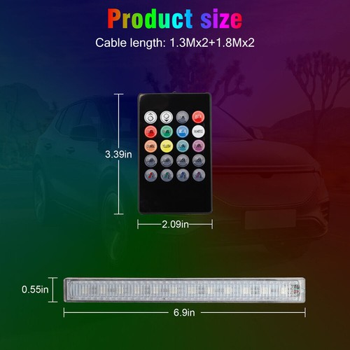 Product Specification Type LED Light Strip Material PC High Brightness Lens Lighting Technology LED Voltage 12V Wattage 20W LED Color RGB Light Color White, Red, Blue, Green, Ice Blue, Orange, Yellow, Pink Number of Light Bars 4 LED Type 5050SMD LED Quantity Total 48 LEDs, 12 LED/Strip Light Cigarette Lighter DV 12V 20-key Remote Control 1Pcs Remote Control Battery 1 x CR2025 Cable Length 1.3Mx2+1.8Mx2 Product Weight 250g Features RGB, Music Rhythm, Flexible, Waterproof, APP Control, Wireless Remote Control
