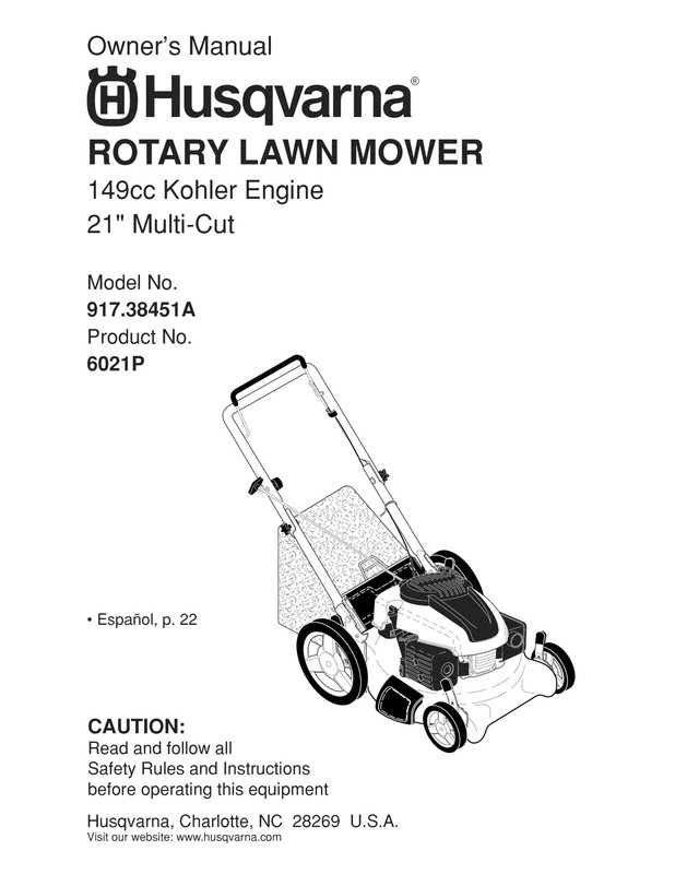 This listing is for a high-quality, 32-page English-Langauge Owner's Manual and Operating Instructions for the Husqvarna, 149cc Kohler Engine, with a 21” Multi-Cut Mower - Model 917.38451A