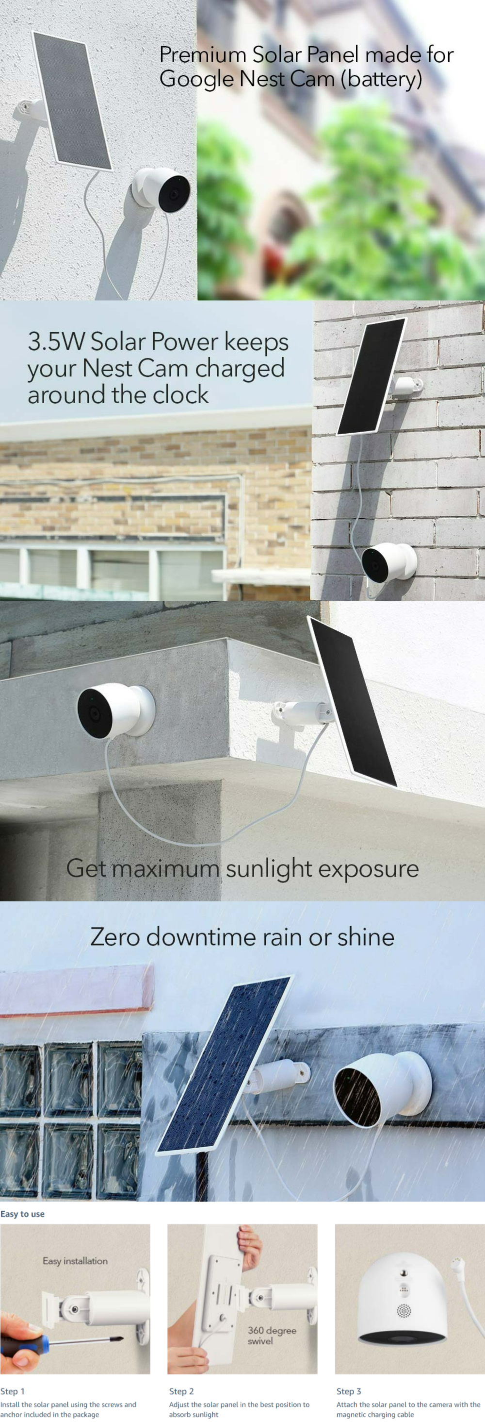 The Wasserstein Premium Solar Panel for Google Nest Cam (battery) with 3.5W solar power is a Made for Google Nest product. The Nest Cam Solar Panel is made of premium US-engineered solar cells that will quickly charge your camera. It is a perfect companion to use with the new New Cam that allows you to be stress-free about changing your batteries with the power of the sun in your corner, constantly charging the camera. The Nest Camera outdoor premium solar panel is the ideal Nest Cam Charger providing non-stop power supply and ensuring maximum compatibility and superior quality.