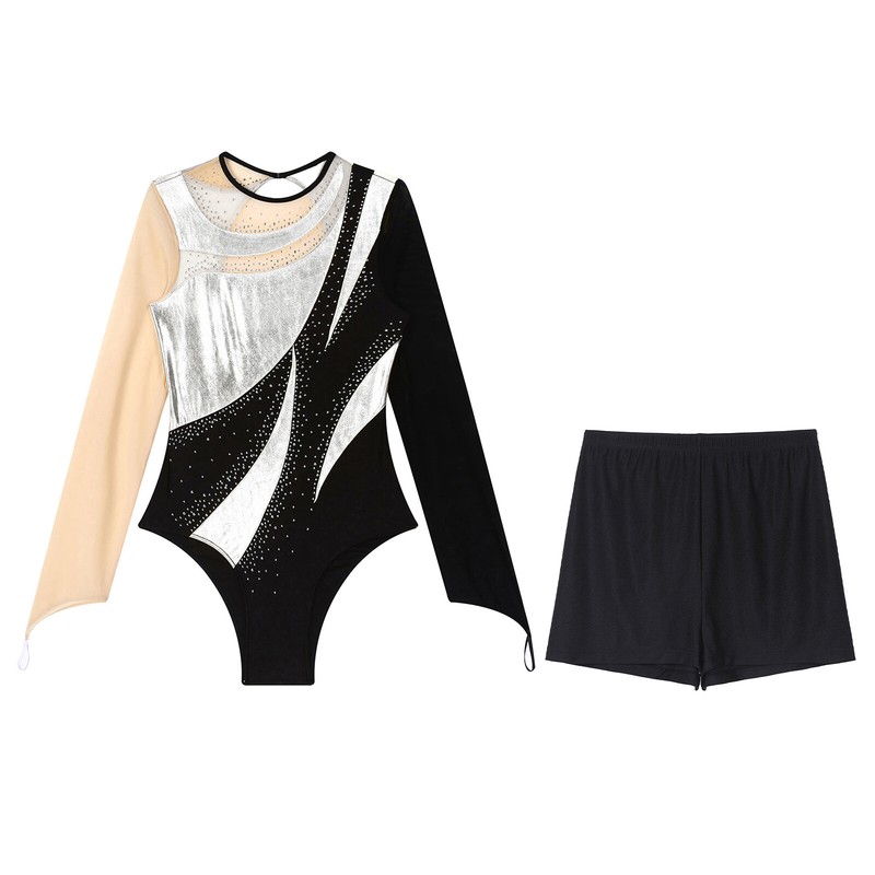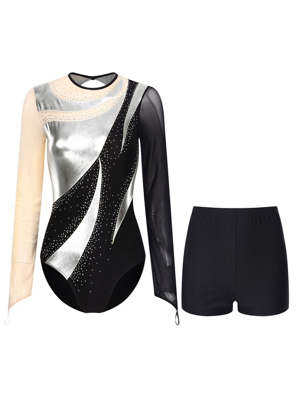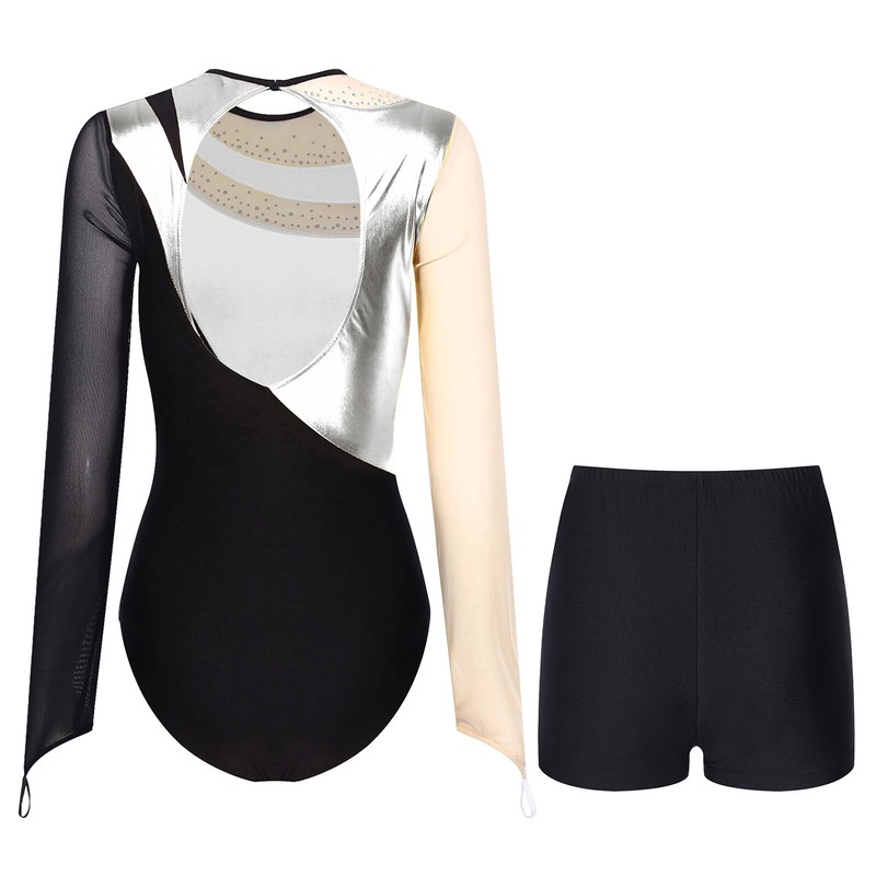 Metallic contrast color patchwork design with rhinestones sparkles under the light to brighten up any performance.