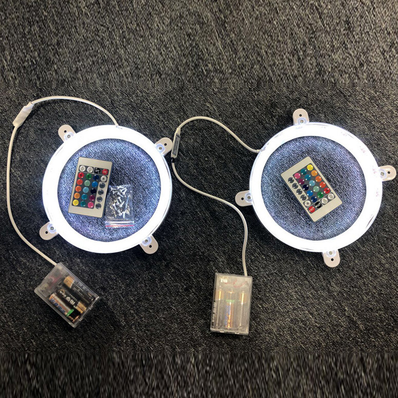 Supports 16 light colors and various lighting modes. Each 3 color change light is equipped with a button control for you change color. Each single color light is equipped with a power switch for you turn ON/OFF. Description: Includes 2 LED light sets Unused/New Premium quality LED lights Perfect size, 6-inch diameter Includes screws Each light requires 2 AA or 3 AA batteries (batteries not included) Control switch/battery box installed under the board Light color: Single color or 3-color or 16-color variations Diameter: 6" Features: Perfect for classic Cornhole games with 2 circular light sets Easy installation on Cornhole boards Mounted on the underside of the board Ensures good illumination of the holes/boards Extend your entertainment into the early hours with lights fixed under each board's battery box for convenient on/off switching Note: 16 color variations with a 24-key remote control for color changing; all colors available on the remote control Package includes: 2 x Cornhole Night Lights Or 2 x Cornhole Night Lights 2 x 24-Key Remote Controls (Only 16 color have) 12 screws