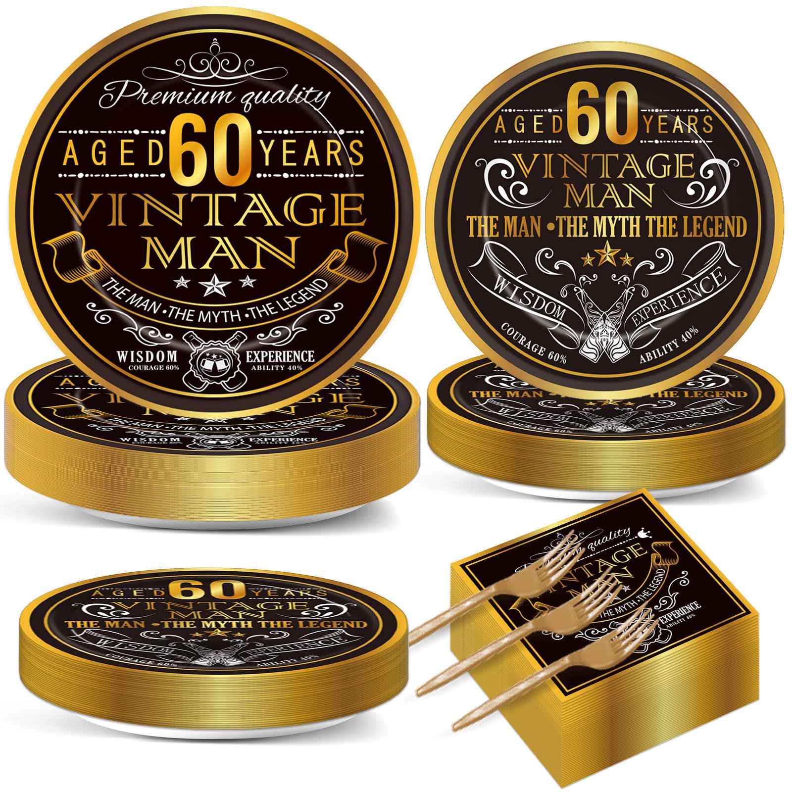 Cheers to 60 Years Party Tableware Set Vintage 60th Theme Birthday Black Gold theme Table Decorations Supplies old man 60th Theme Party Paper Plates Napkins Forks for 50 Guests Specifications: Material: Paper Size: 9’’ for large size plates; 7’’ for small size plates;6.5’’ for napkins Color: as the picture shown Package Includes: 50 x 9’’ Plates 50 x 7’’ Plates 50 x Napkins 50 x Forks Aged Man Party Table Settings: These Back in 1964 60th theme party decoration will make your table settings look fantastic and all your guests will be happy.