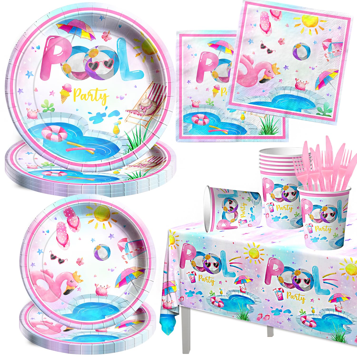- 【PINK POOL DECORATION 】Do you want to have an impressive pool theme party?This 141pcs pink pool dinnerware set will meet all your needs.This pool birthday supplies will be the center of attention at the party, your friends and customers will love it!