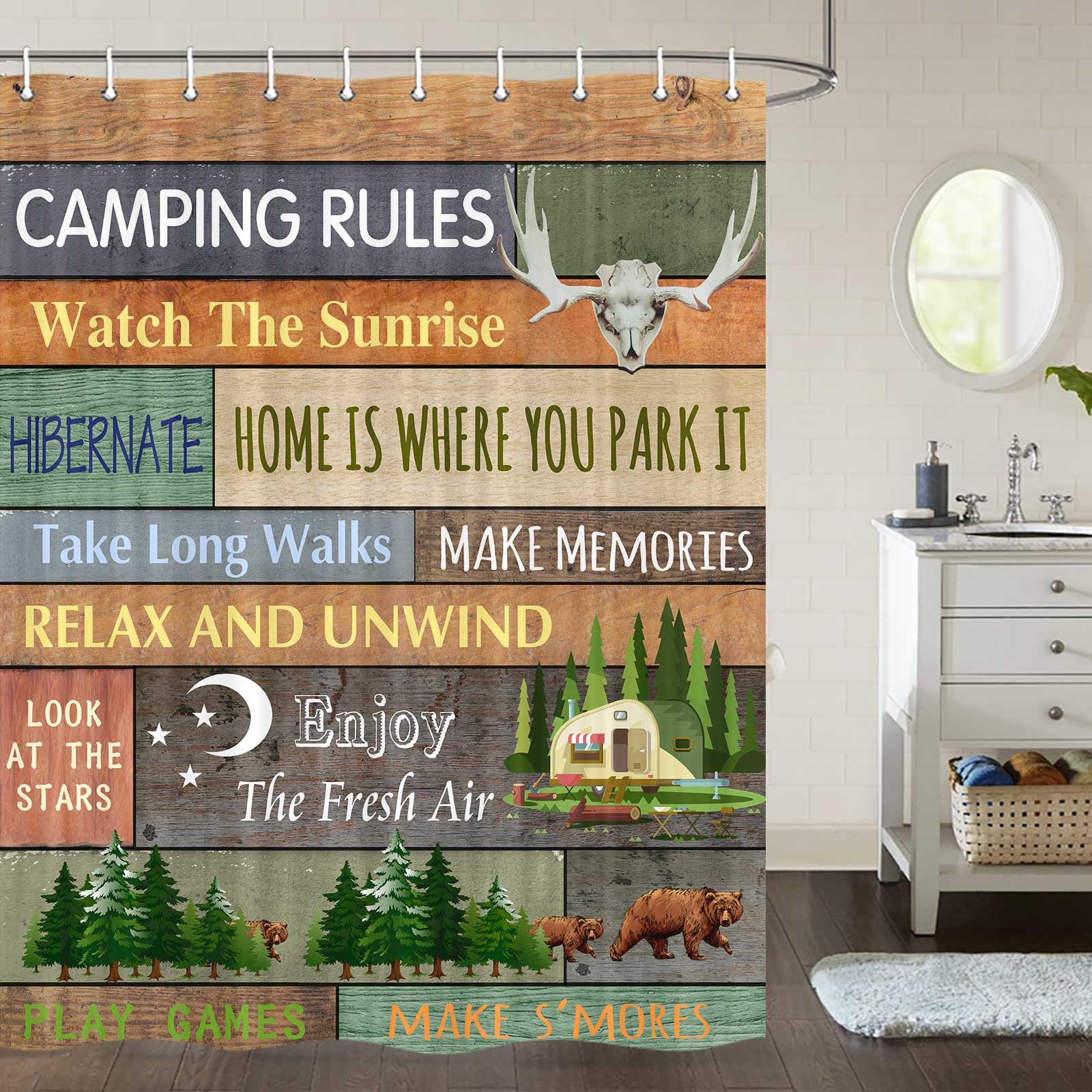Campers RV Shower Curtain for Travel Trailer Bathroom, Farmhouse Camping Rules Quote Small Narrow Shorter Fabric Shower Curtains Set, Happy Camping Outdoor Decor Accessories with Hooks 47X64
