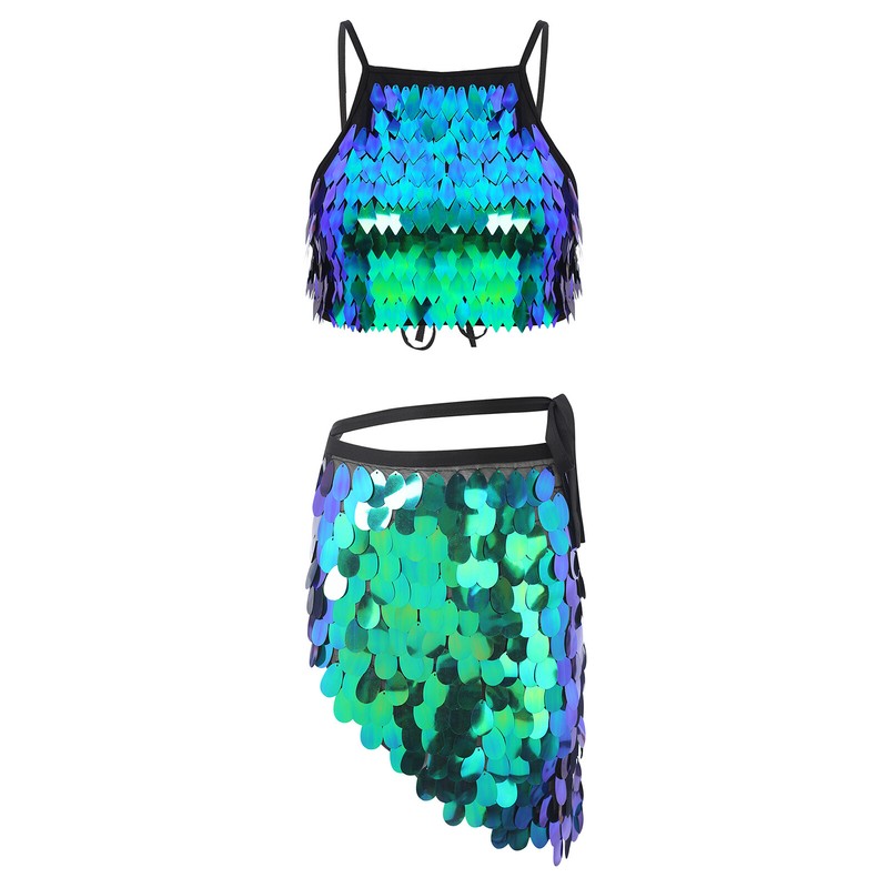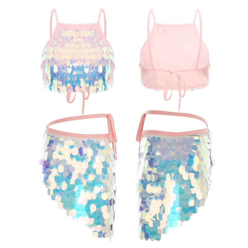 Bra top is designed with spaghetti straps, shiny sequin tassel and back lace-up; matches with triangle hip scarf, lacing up for a better fitting.