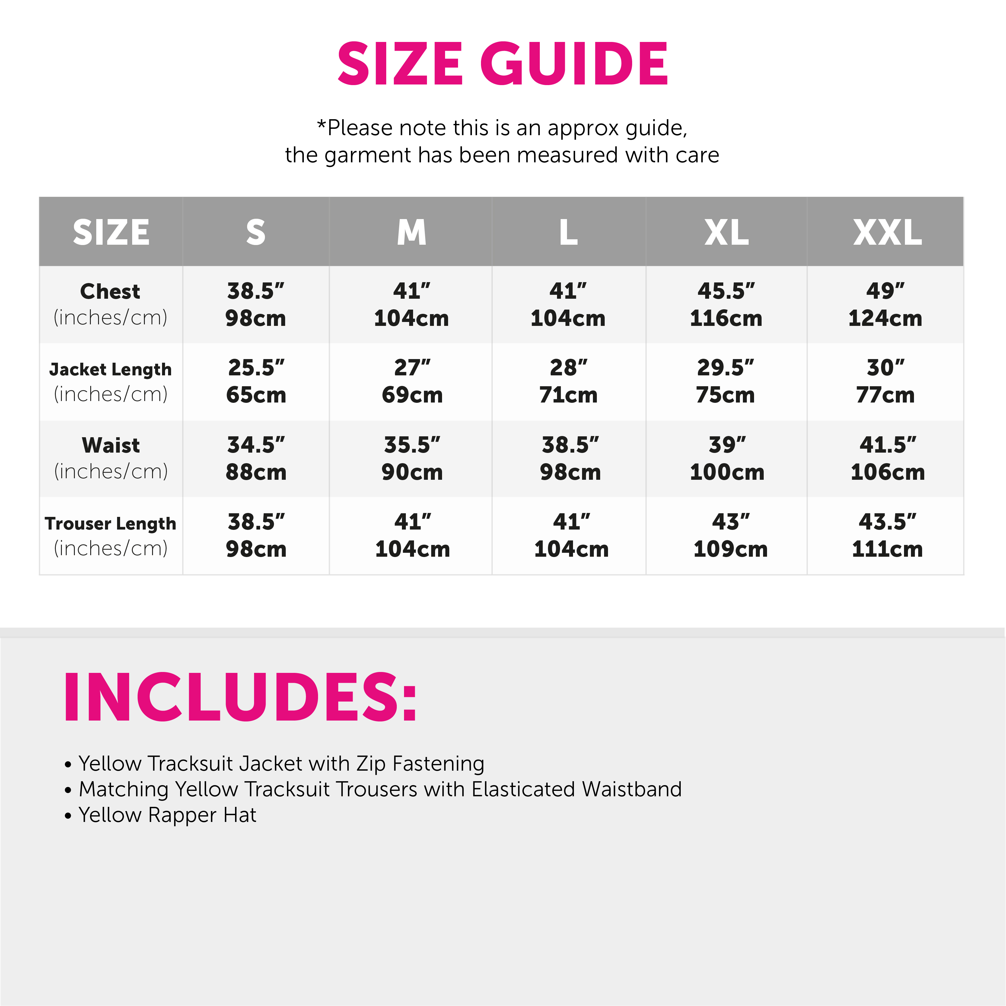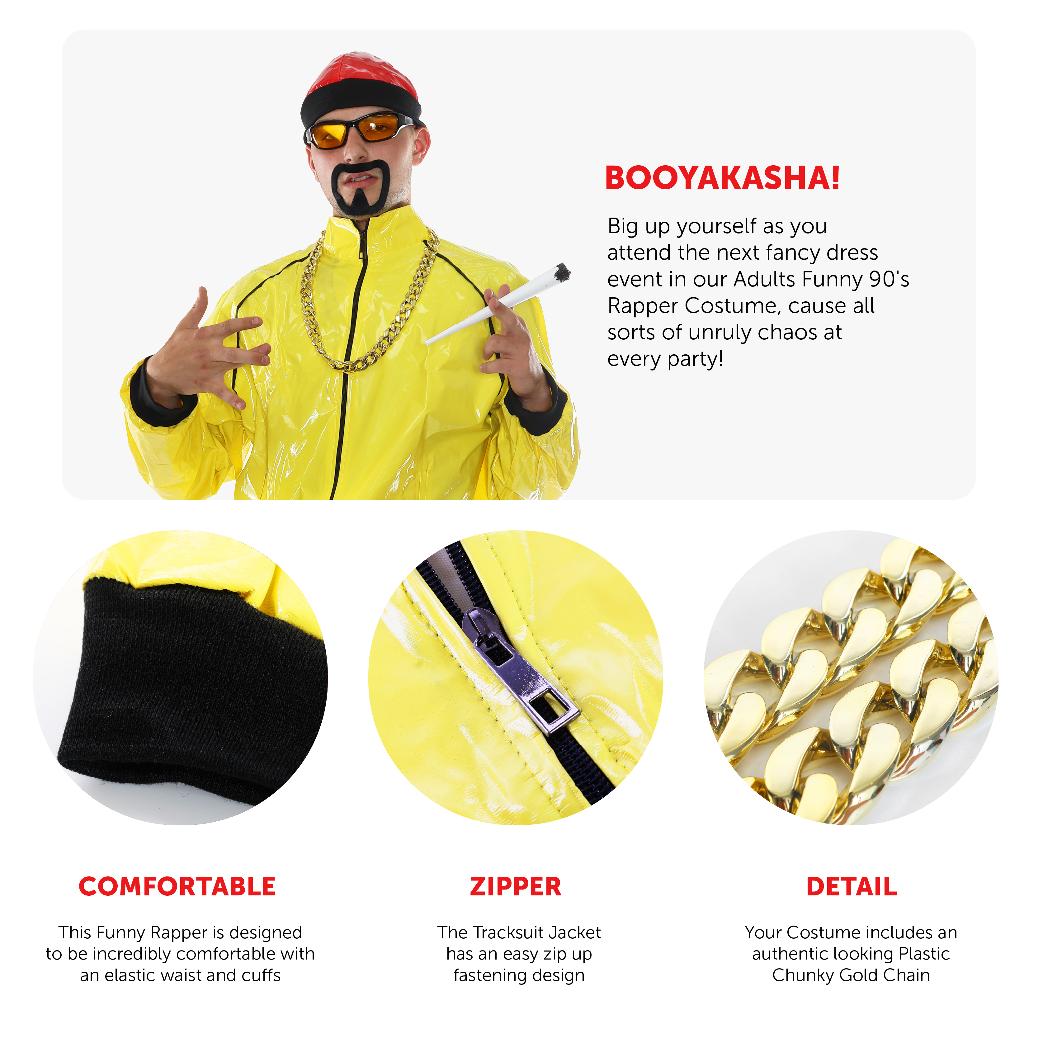 COSTUME DETAILS: Your Funny Rapper Costume includes a bright Yellow Tracksuit Jacket with matching Trousers, a Red Hat, Yellow Lens Sunglasses, a Black Adhesive Goatee Beard, a Chunky Plastic Gold Chain Necklace, and a Novelty Jumbo Spliff, the perfect Costume set for any fancy dress event!