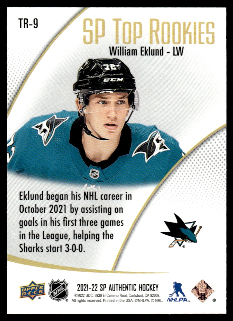 | 2021-22 SP Authentic Top Rookies William Eklund San Jose Sharks #TR-9 |