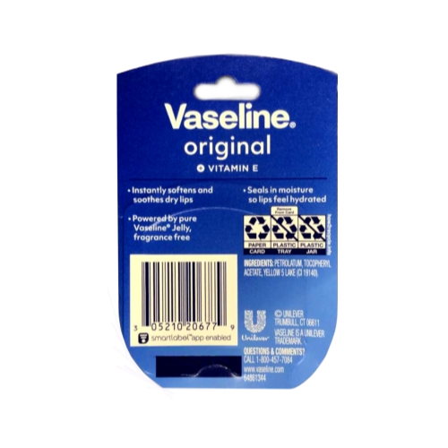 Made with 100 percent pure triple-purified petroleum jelly, Vaseline Lip Therapy Original gives your lips all-day softness. The lip therapy works quickly to soothe dry lips, locking in moisture to keep your lips looking healthy and feeling better over time. The mini portable compact container fits neatly into purses, backpacks, or desk drawers.