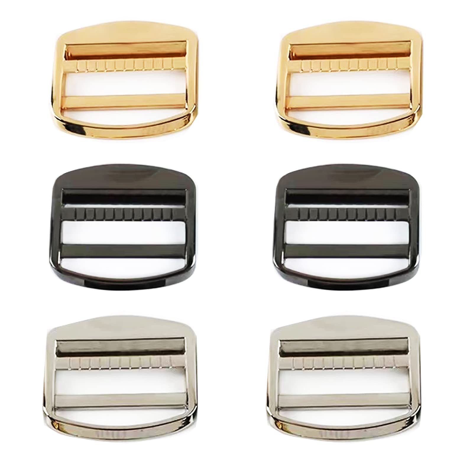 1.5” Metal Ladder Lock Buckle Strap Adjuster- 3 Colors Purser Hardware for Bag Making Set PACKAGE INCLUDES: 6 pcs strap buckles 2 x Gold; 2 x Silver 2 x Gun Black MATERIAL: Zinc Alloy SIZE: Inside Width-1.5 inch (38mm); PRODUCT FEATURES: ✮[DURABILITY]: This 6 pcs strap adjuster buckle set is made of premium zinc alloy, sturdy, rust proof; Extra surface plating presents glossy looking, plastic ones! Premium material ensures long service life! ✮[WIDEAPPLICATION]: The strap buckle set can be widely applied to webbing, fasteners strap, dog collars, leather belt, backpack, handbag, and more; useful purse hardware replacement.