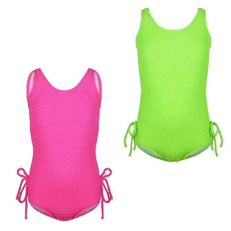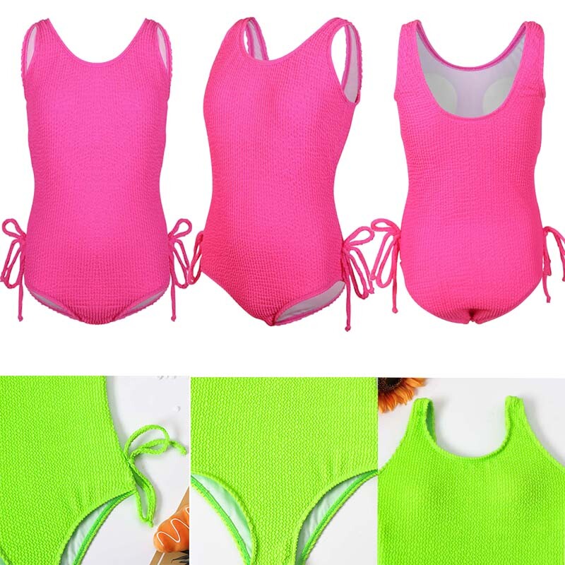 Textured swimsuit with bright color make girl look more active, beautiful and eye-catching.