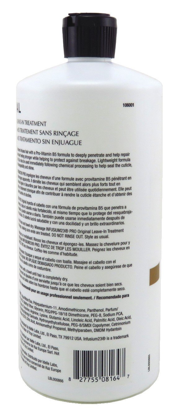 Infusium 23 Pro Original Leave-in-Treatment, 33.8 fl oz. Infuses hair with a Pro-Vitamin B5 formula to deeply penetrate and help repair the signs of damage, it also detangles and leaves hair feeling stronger while helping protect against breakage. The lightweight formula won't weigh hair down so it can be used daily. Can also be used immediately following chemical processing to help seal the cuticle, leaving hair healthy-looking with superb manageability and shine.