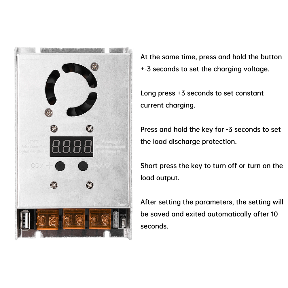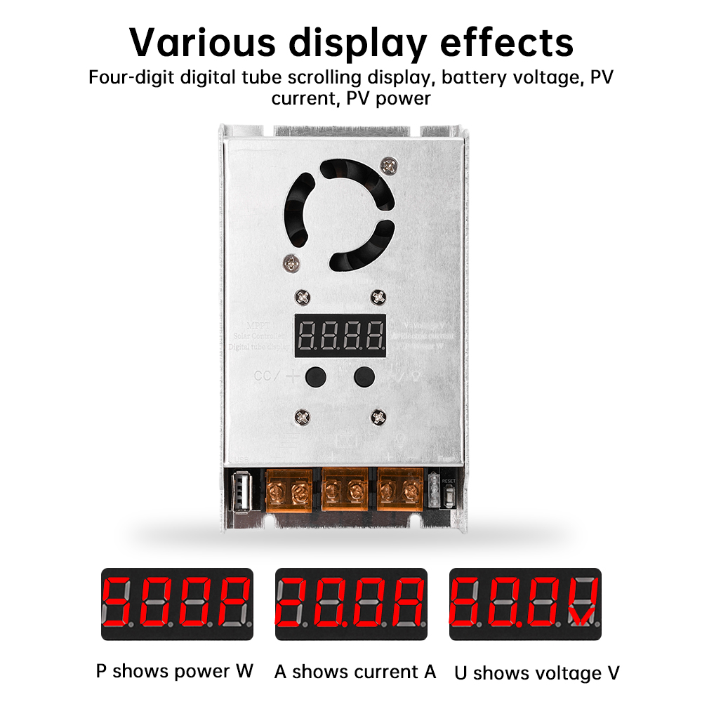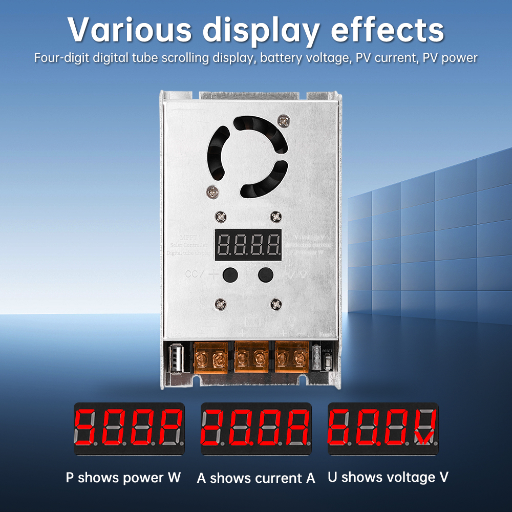 5. Multiple display effects, including four digit digital tube scrolling display, battery voltage, photovoltaic current, photovoltaic power, etc