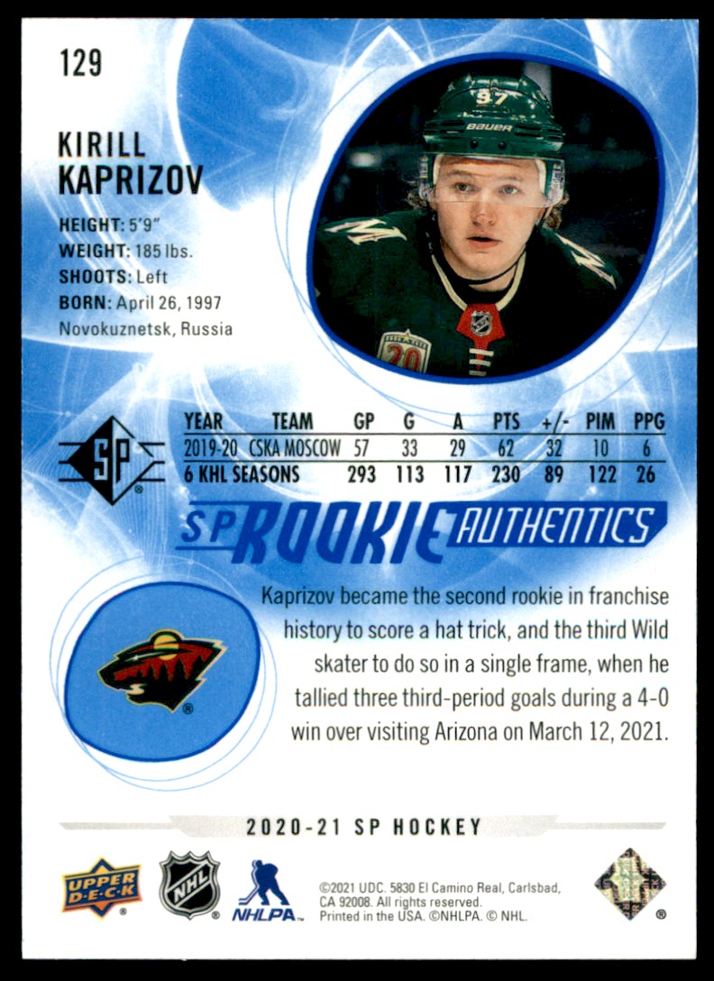 | 2020-21 SP Rookie Authentic Blue Kirill Kaprizov #129 | ||||||||||||||||