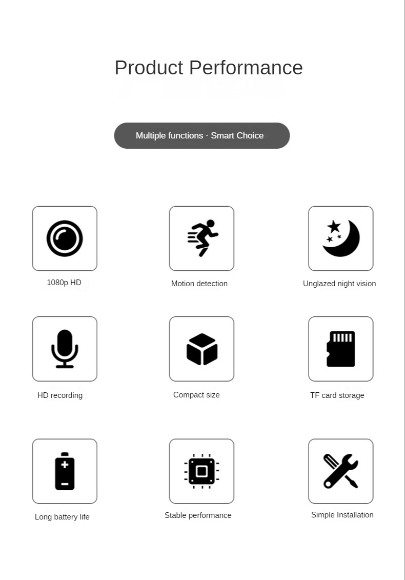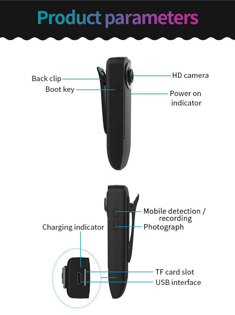 ▪This cameras equipped with both 1080p HD video shoot and high-resolution photo-taking capabilities. The mini camera generates 1080p color HD video at 30 FPS. In standby mode, one-click the top button to take 1920*1080 photos.
