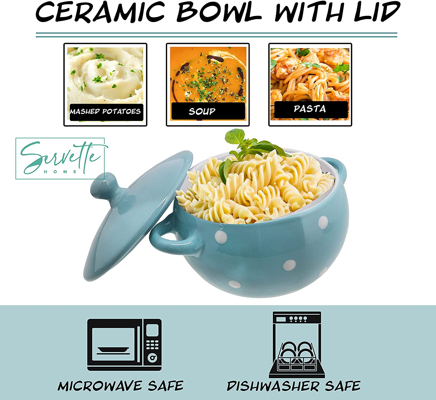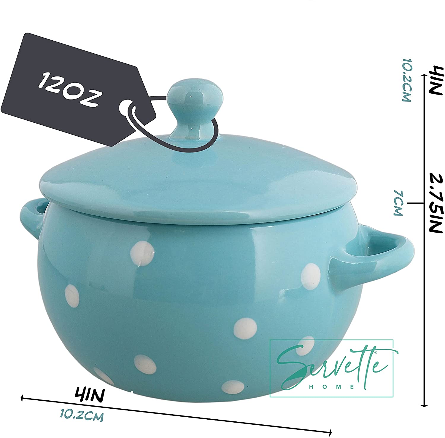Beautiful set of 4 soup bowls with handles and lids for your next event. Dishwasher and microwave safe, these crock cocottes bowls will hold up to 12 ounces of your favorite soup, casseroles, mac n' cheese, pot pies, cobblers and other hot dishes. The lids keep the contents steamy and hot and handles make it easy to transport. Decorated with polka dots for a fun soup bowl!