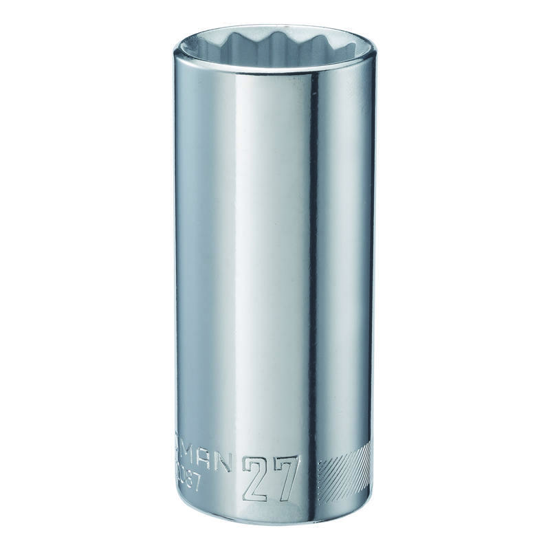 1/2-in. Drive 12 Point 27mm Deep Socket features a deep well construction and internal construction designed to engage with the flats of fasteners. This allows for the user to reach those receded difficult to reach fasteners and torque without the fear of stripping a bolt. Deep Sockets come in a broad range of SAE and Metric sizes, have large size markings for quick identification, and a full polish chrome finish helps improve corrosion resistance.
