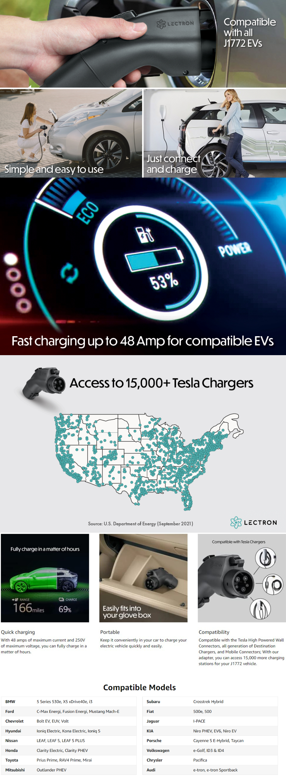COMPATIBILITY - Compatible with the Tesla High Powered Wall Connectors, all generation of Destination Chargers, and Mobile Connectors; With our adapter you can access 15,000 more charging stations for your J1772 vehicle