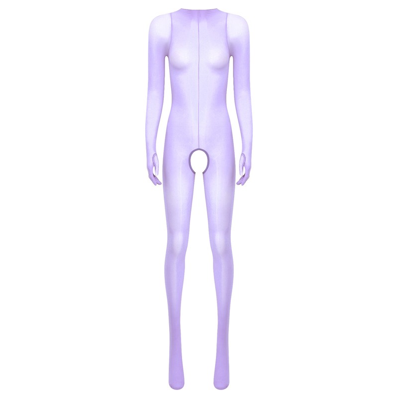 One-piece bodysuit is designed with round neck, gloved long sleeve, footed, glossy and see-through fabric, making you superbly sexy and charming.