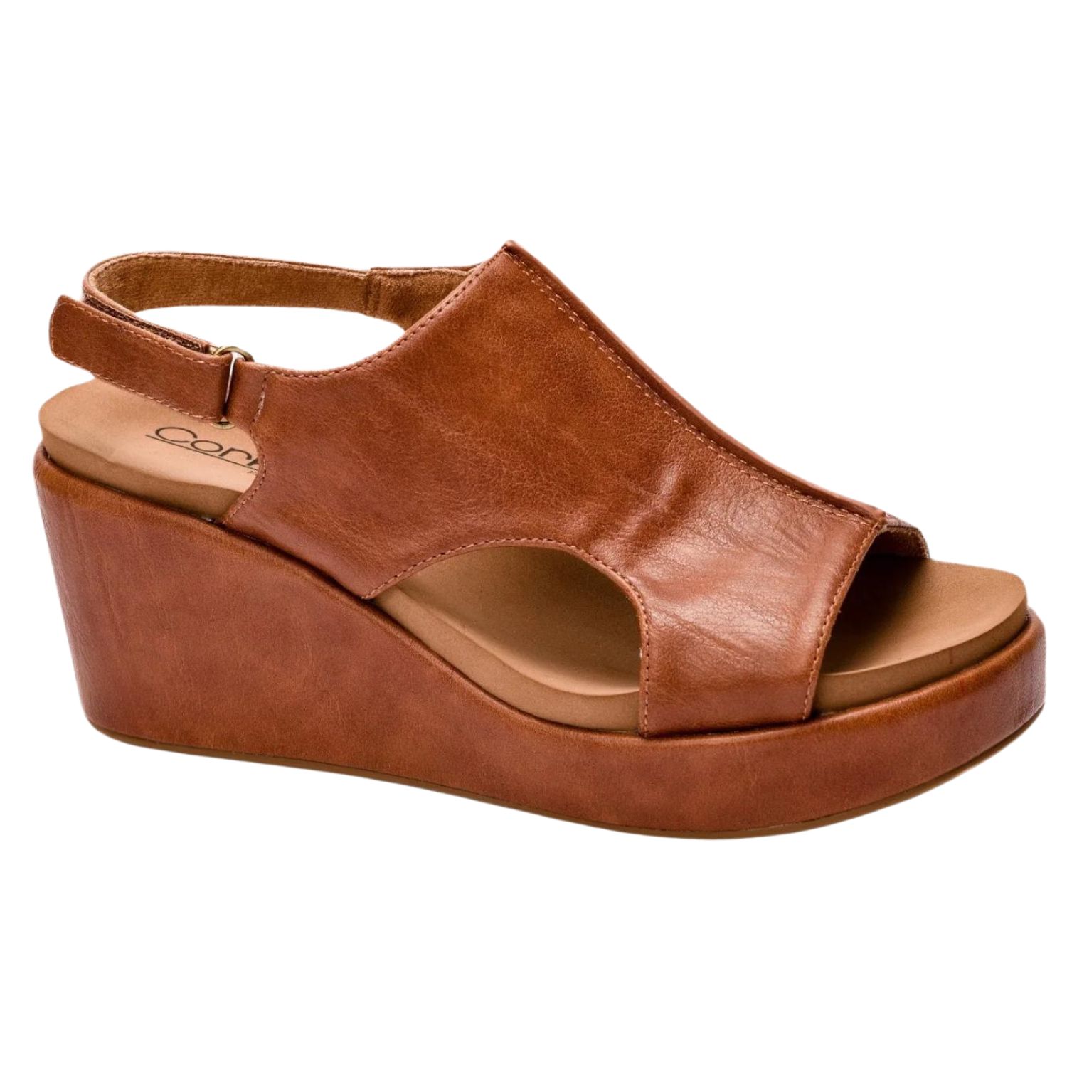 The Carley Too Wedge Sandal from Corkys is a stylish summer sandal featuring an adjustable slingback design with a faux leather upper.