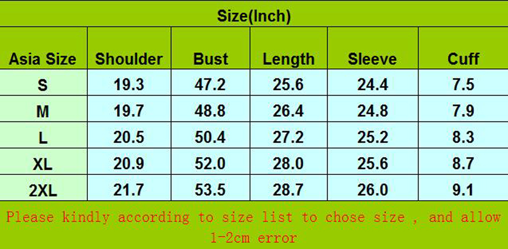 Please note: 1.Please allow a little error due to manual measurement. 2.The color maybe a little difference because of the light,screen reflection etc. 3.If you are not sure what size to choose, you can tell us your height and weight, we will recommend the right size for you.