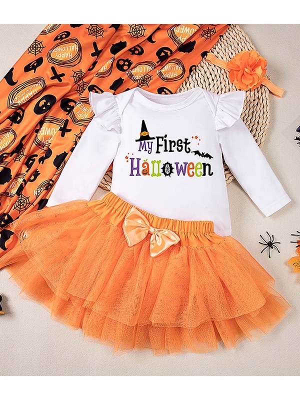 Orange pumpkin, bat, witch hat and black cat print adds halloween party atmosphere to child.