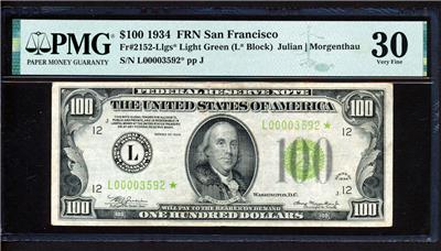 Fr.2152-Llgs* 1934 $100 SAN FRANCISCO FEDERAL RESERVE NOTE "STAR" LIGHT GREEN SEAL LOW SERIAL NUMBER L00003592*SUPER RARE COLLECTIBLE!! THIS BEAUTIFUL NOTE IS GRADED PMG VERY FINE 30. GRADING BY PMG ASSURES YOU A TOP QUALITY NOTE. THIS GORGEOUS NOTE WOULD BE A GREAT ADDITION TO ANY COLLECTION. ASSURE YOUR PIECE OF HISTORY TODAY.