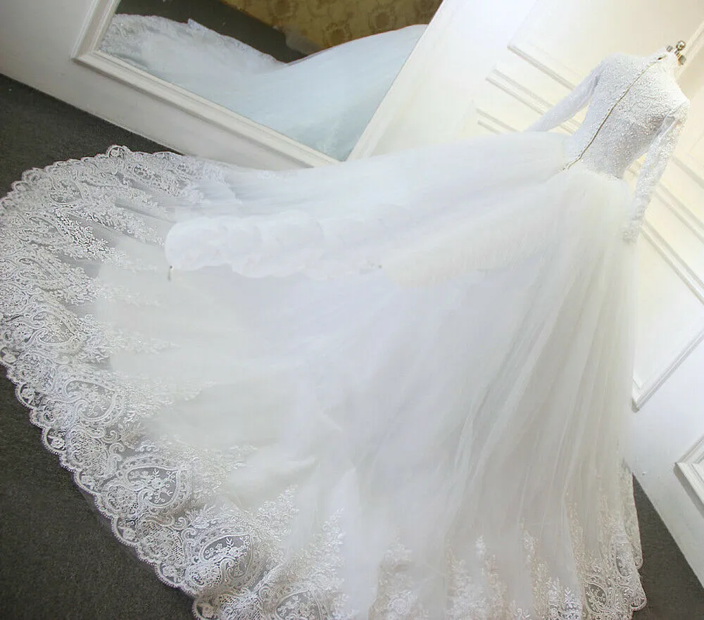 White Muslim Wedding Dresses Lace Applique Long Sleeve Ball Gown Zipper Tulle