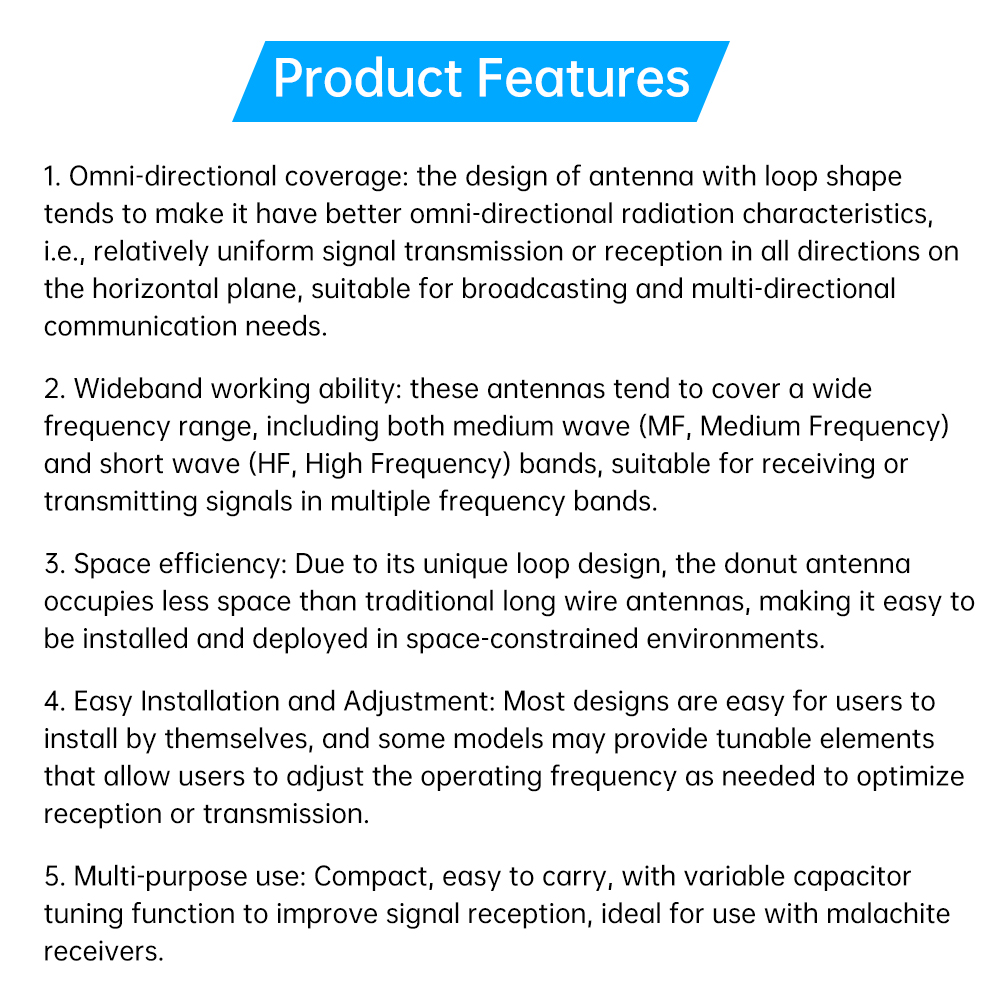 3. Space efficiency: Due to its unique loop design, the donut antenna occupies less space than traditional long wire antennas, making it easy to be installed and deployed in space-constrained environments.