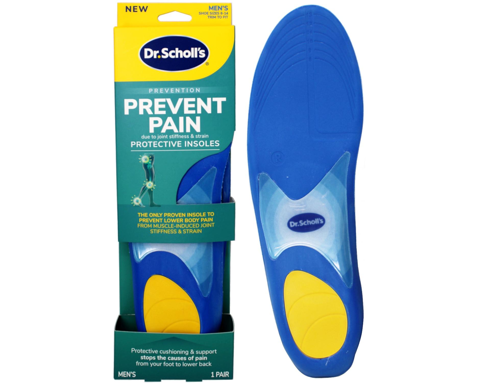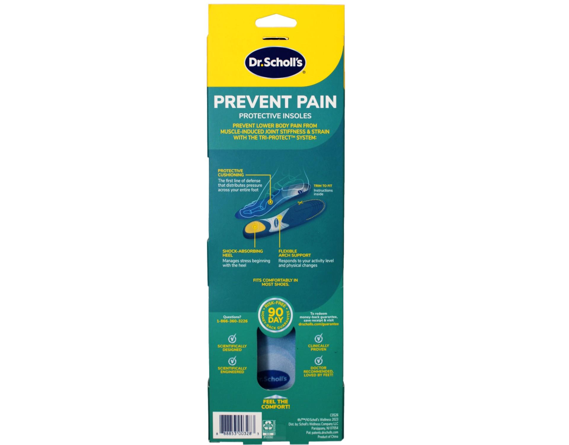 Dr. Scholl's® Prevent Pain protective insoles are designed for those who have had prior episodes of daily pain and want to stop it from reoccurring, or want to be proactive and help stop pain from occurring in the future. The new Prevent Pain insoles are scienti?cally designed and clinically proven to reduce the leading cause of pain in key lower body joints - your foot, knee to lower back from reoccurring. Dr. Scholl's® Prevent Pain Insoles prevent pain from muscle-induced joint stiffness and strain caused by conditions or activities like recent reduction in activity or weight gain, ?at feet, overpronation, over-supination, bad posture, heavy or uneven pressure, and working, walking, or running on hard surfaces. Dr. Scholl’s® Prevent Pain Protective Insoles stops the leading cause of pain in key lower body joints – your foot, knee to lower back before it occurs with the Tri-Protect System™. Its full foot combination of cushioning, support and shock absorption defends against the muscle co-contraction that leads to lower body joint pain. The only proven insole to prevent 3 lower body pains. Prevents against and reduces pain in foot, knee, and lower back pain by reducing muscle-induced joint stiffness and strain. Full foot combination of cushioning, support & shock absorption defends against muscle co-contraction that leads to lower body joint pains. The design of these insoles helps alleviate and prevent the occurrence of pain in your foot, knee, and lower back. Impact absorbing cushioning protects and defends feet from becoming sore and achy by distributing pressure and tension across your entire foot. While the shock absorbing heel cup provides support and manages stress beginning with the heel. Adjusts with your activity level with its flexible arch support. Great to use before, during, & after fitness activities - as well as everyday errands that keep you on your feet. Trim to fit your size in any shoe - running sneaker, casual shoes, & more. We believe that overall health & wellness starts from the ground up! Our Prevent Pain insoles provide a step in the right direction towards proactive and preventative health. Help Stop lower body pain before it starts in a nonmedicinal way. Protective Cushioning - The first line of defense that distributes pressure across your entire foot Shock-Absorbing Heel- Manages stress beginning with the heel Flexible Arch Support - Responds to your activity level and physical changes
