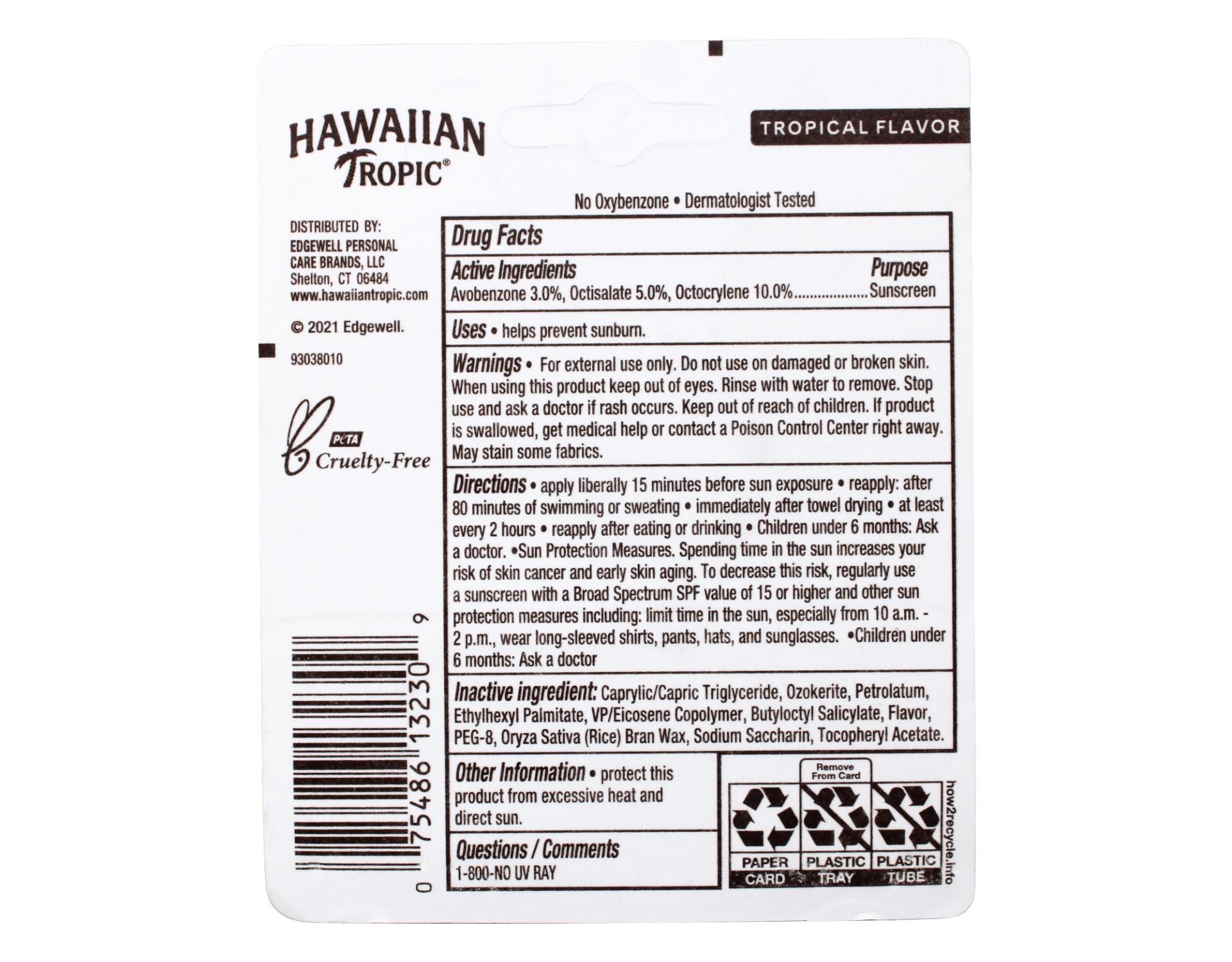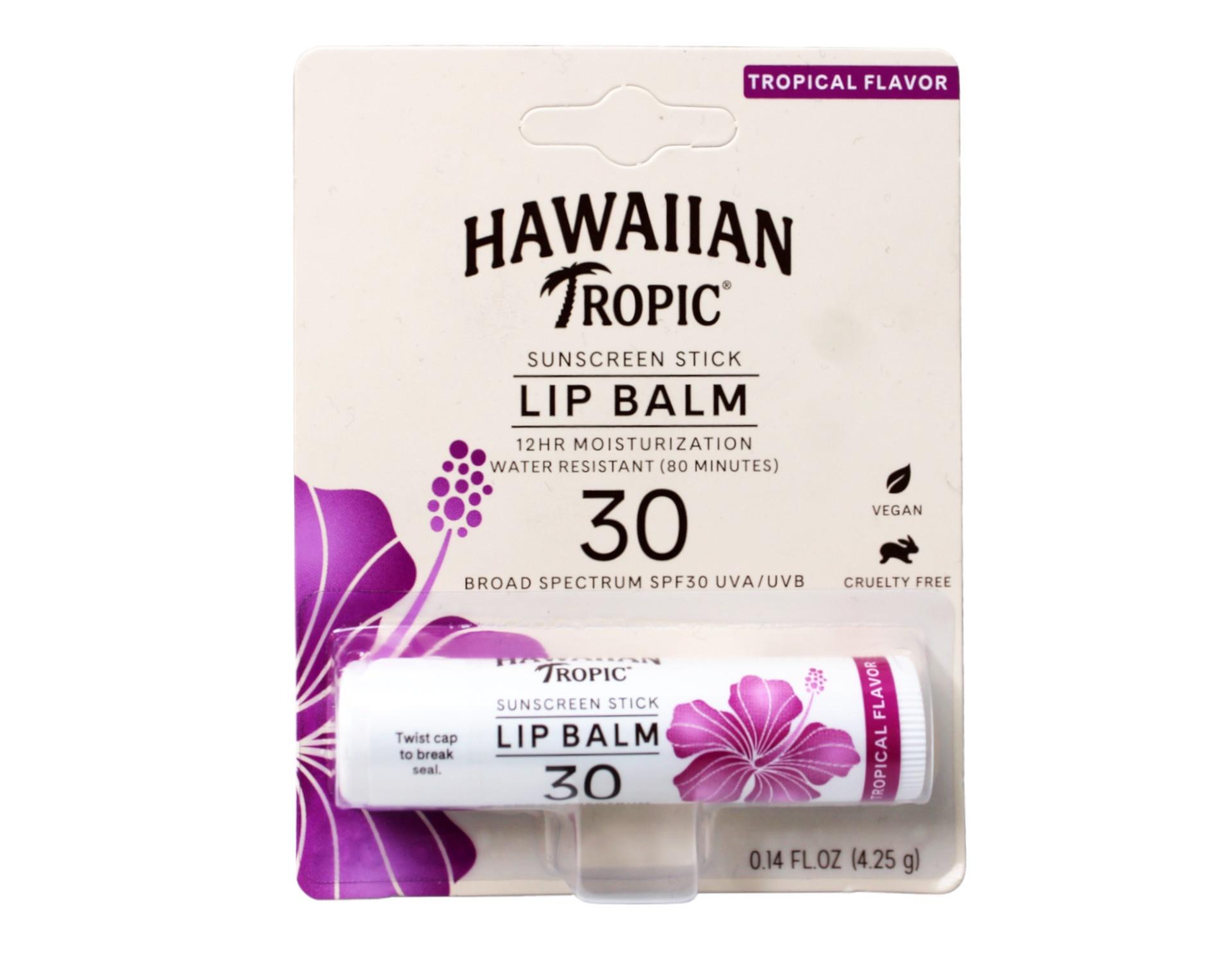 Soften, moisturize and protect your lips. Hawaiian Tropic Tropical Lip Balm with sunscreen is a lightweight and non-waxy SPF lip balm that protects your lips from the sun with broad spectrum UVA and UVB protection. This smooth travel-size lip sunscreen gives you 12 hours of moisturization in a delicious tropical flavor! In addition to caring for your skin, Hawaiian Tropic is also doing its part to help care for the environment by formulating vegan suncare that’s PETA-certified Cruelty-Free and free from oxybenzone and octinoxate. DON'T FORGET YOUR LIPS - Hawaian Tropic lip balm softens and moisturizes while protecting from the sun BEAUTIFULLY NOURISHING - lightweight, non-waxy lip balm leaves lips feeling soft while moisturizing for up to 12 hours MADE CONCIOUSLY - No Animal Testing and made with island botanicals DERMATOLOGIST TESTED - broad spectrum UVA/UVB protection OXYBENZONE & OCTINOXATE FREE - for protection that is safe Reef Friendly, Cruelty-Free sunscreens