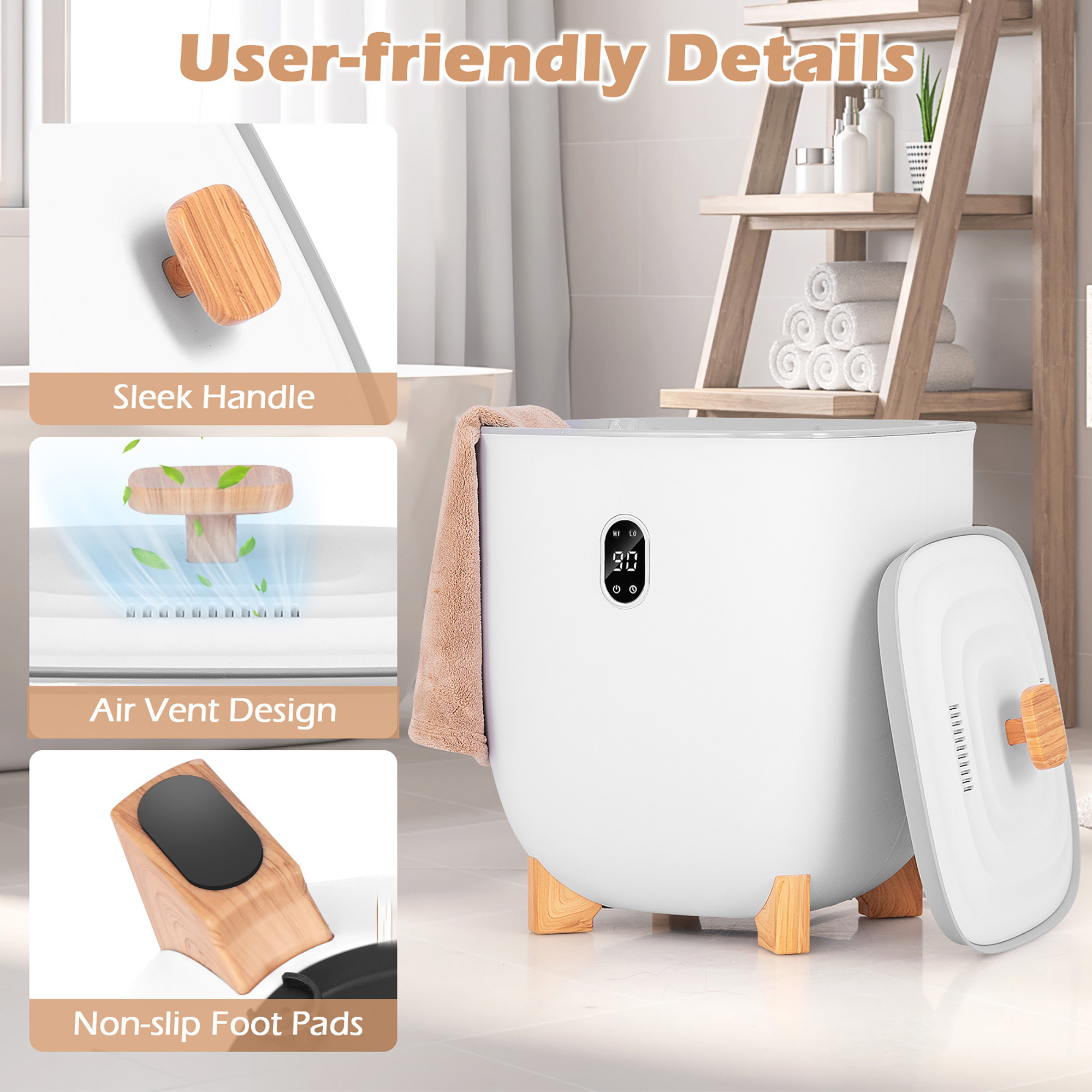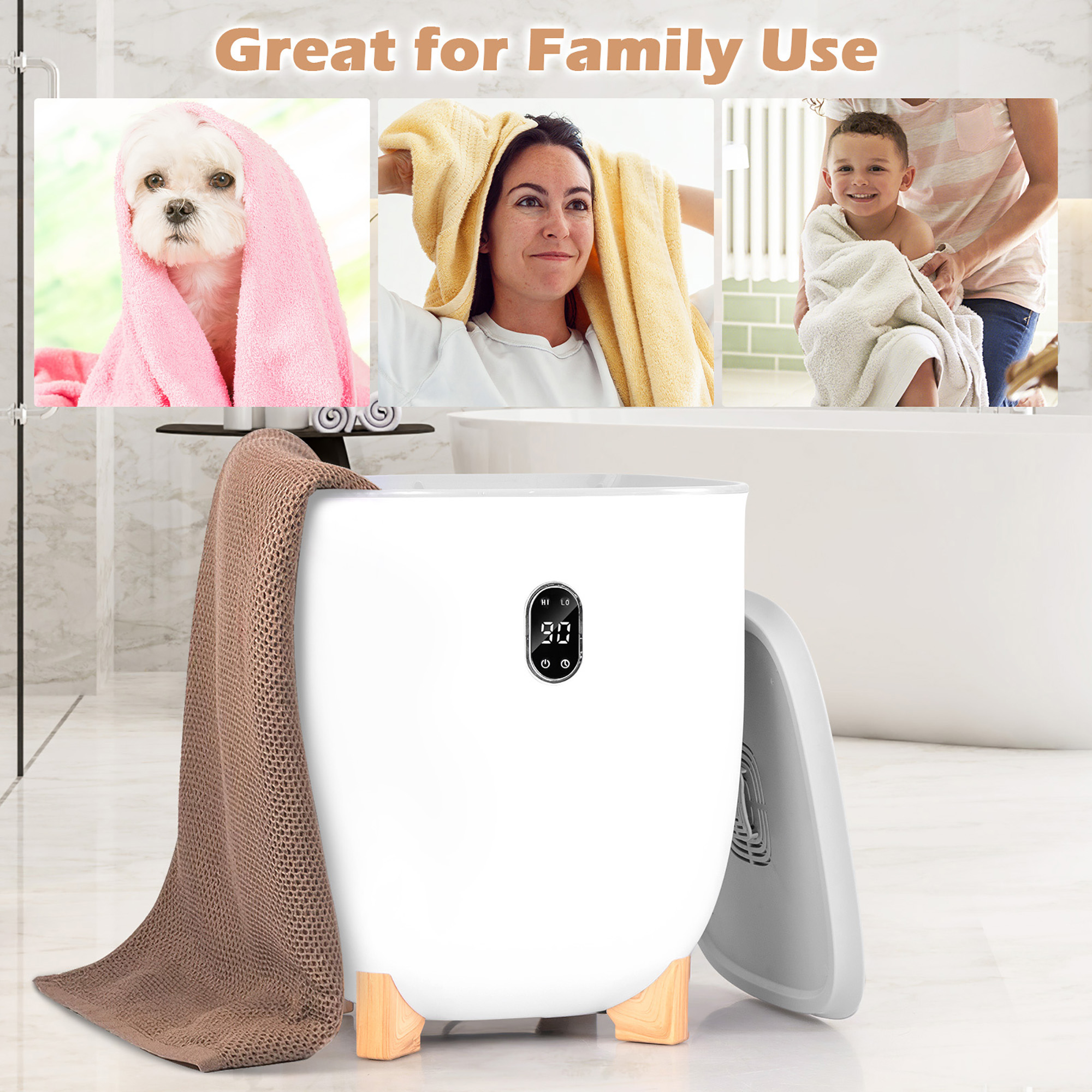 Enhance your bathing experience with our towel warmer bucket. The inner core heats up quickly and evenly, which is effective to fluff your towels and garments. The 25L capacity towel heater allows you to wrap yourself in the warm comfort of heated towels, bathrobes, and even blankets, making every bath or shower a spa-like indulgence. The control panel makes operation a breeze. Choose your perfect level of coziness with 2 temperature settings and smart timer. Moreover, safety is paramount with the automatic shut-off feature that prevents overheating. Looking for a thoughtful and luxurious gift? This electric towel warmer is an excellent choice. Warm Tips: Only for heating dry towels.