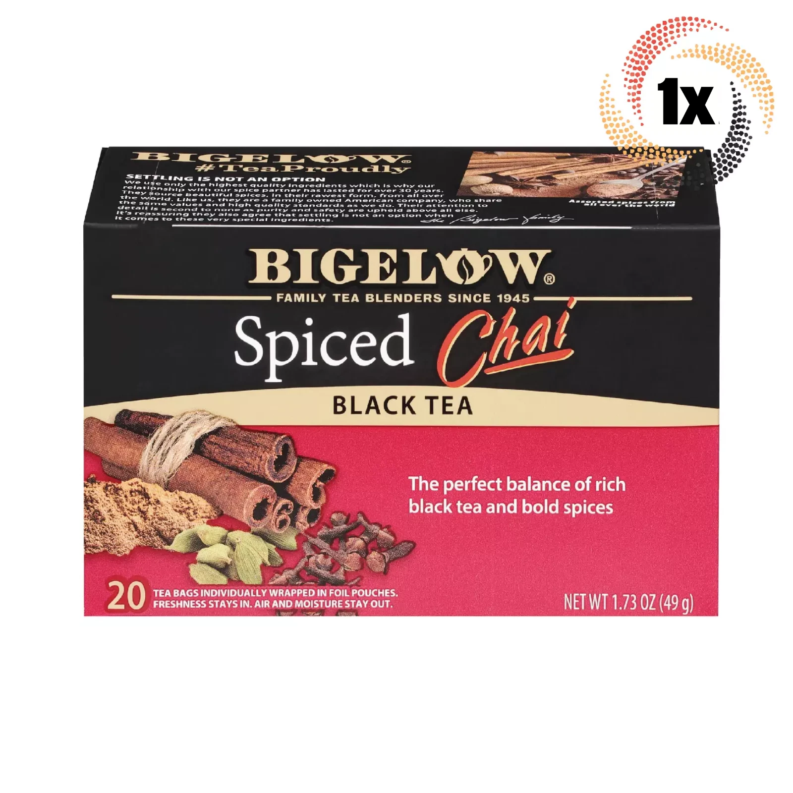 Each ingredient has been carefully selected by the Bigelow family to deliver an uncompromised quality tea experience. Bigelow Spiced Chai is a perfect blend of rich black tea and flavorful bold spices. Try it on its own or with a little milk and sweetener.
