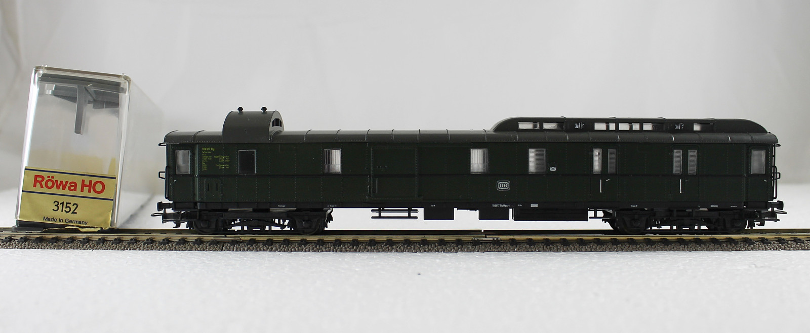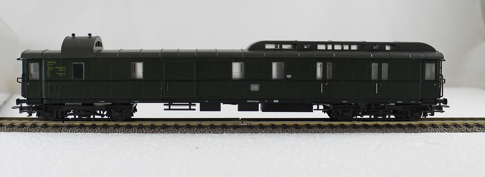 Vorbild: Vierachsiger Packwagen mit Postabteil PwPost4üe der Deutschen Bundesbahn (DB) in grün. Betriebsnummer 100 017.